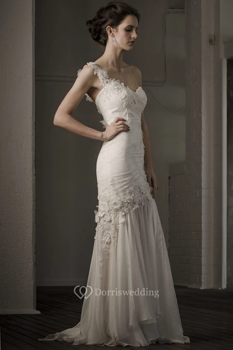 Sheath Appliqued Maxi One-Shoulder Sleeveless Lace Wedding Dress With Pleats And Flower