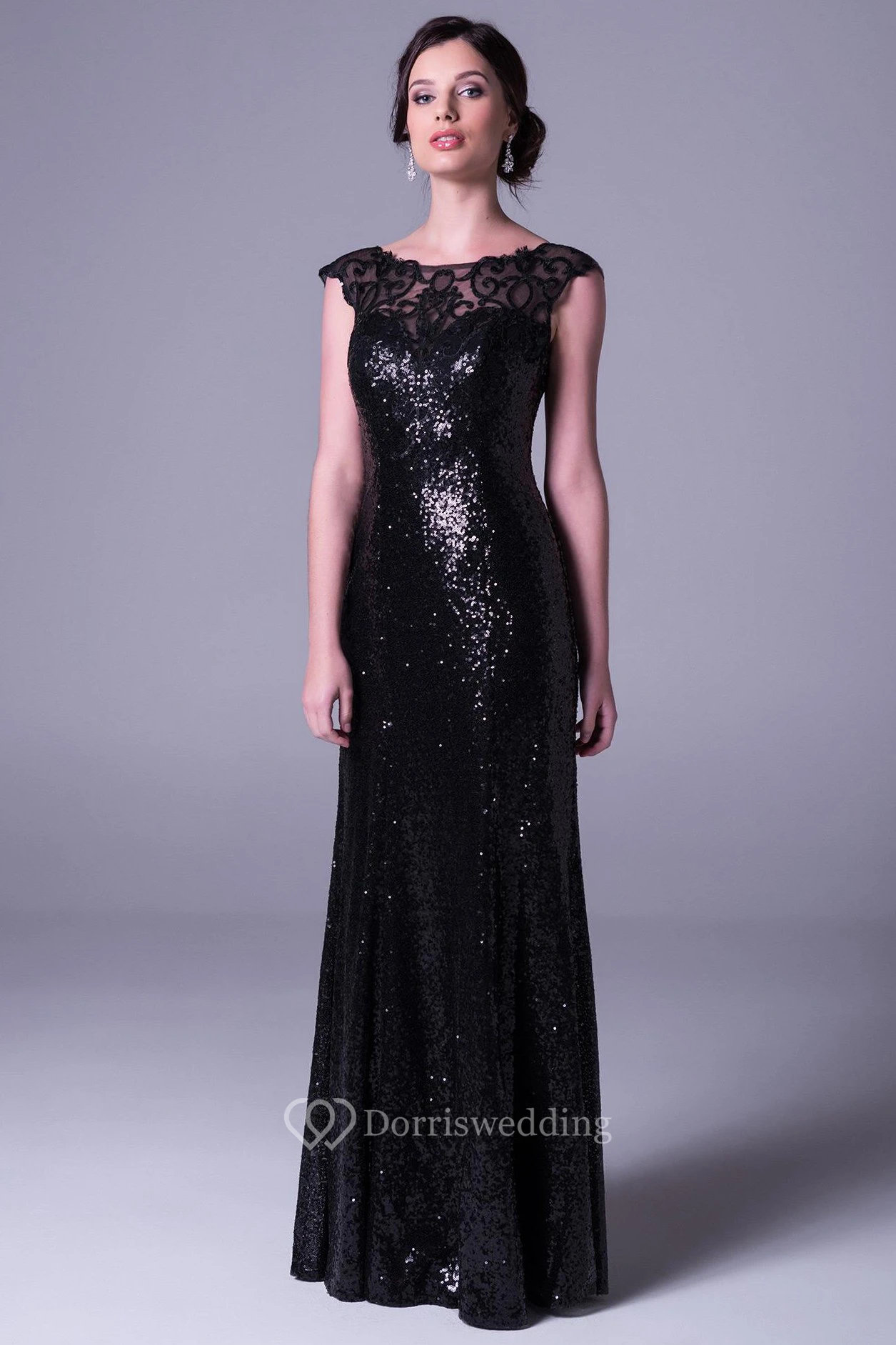 Sheath Appliqued Scoop-Neck Cap-Sleeve Floor-Length Sequins Prom Dress