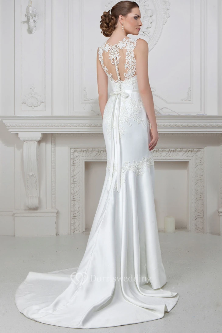 Sheath Appliqued Sleeveless Maxi Jewel-Neck Satin Wedding Dress With Bow