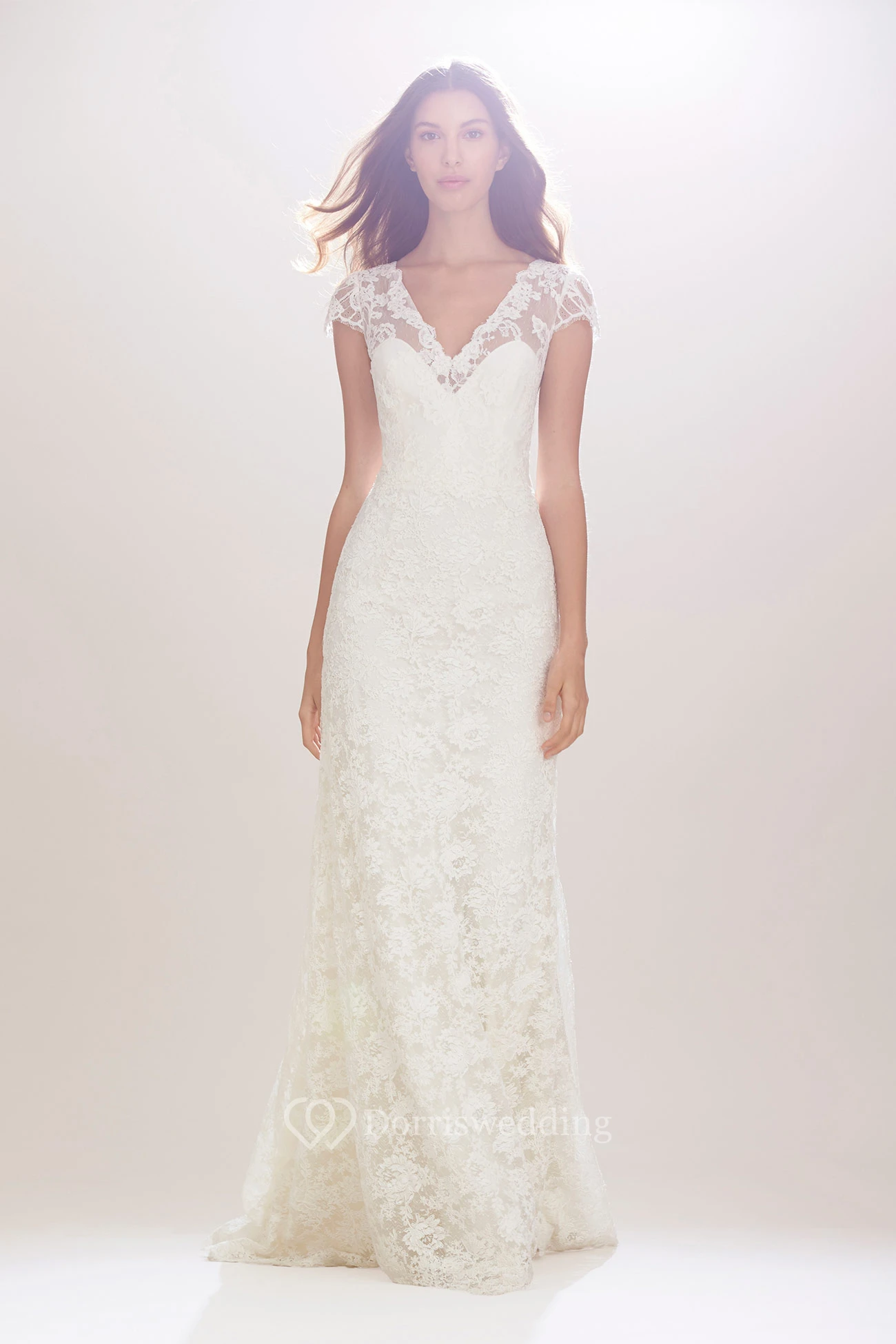 Sheath Appliqued V-Neck Cap-Sleeve Long Lace Wedding Dress With Ribbon And Illusion