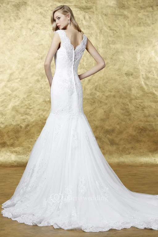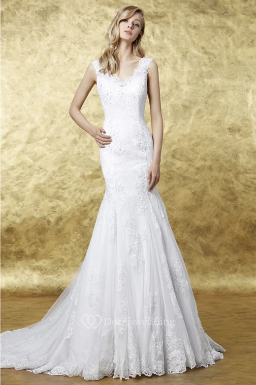 Sheath Appliqued V-Neck Sleeveless Long Lace Wedding Dress With Low-V Back And Pleats