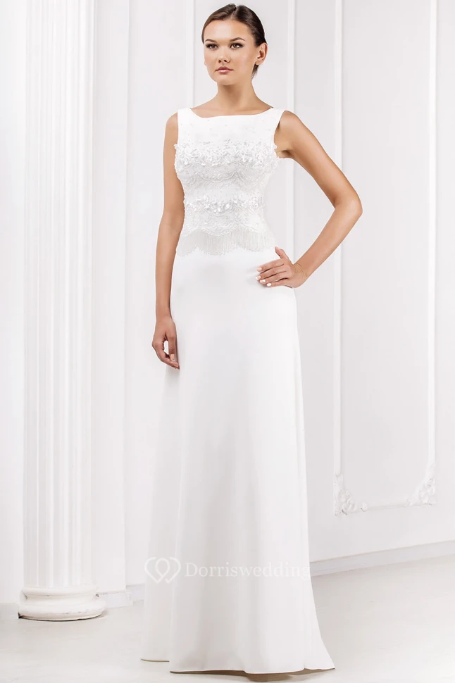 Sheath Bateau Appliqued Sleeveless Floor-Length Satin Wedding Dress With Keyhole Back And Sweep Train