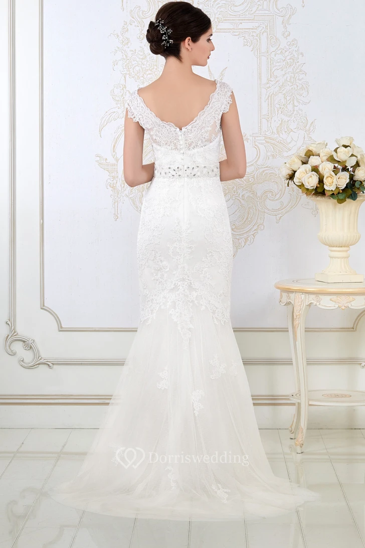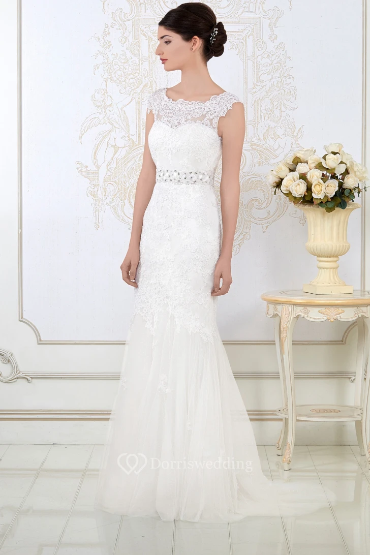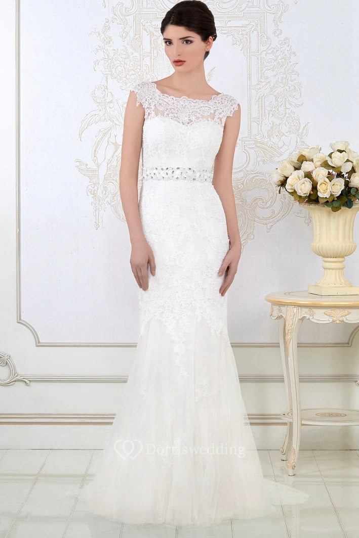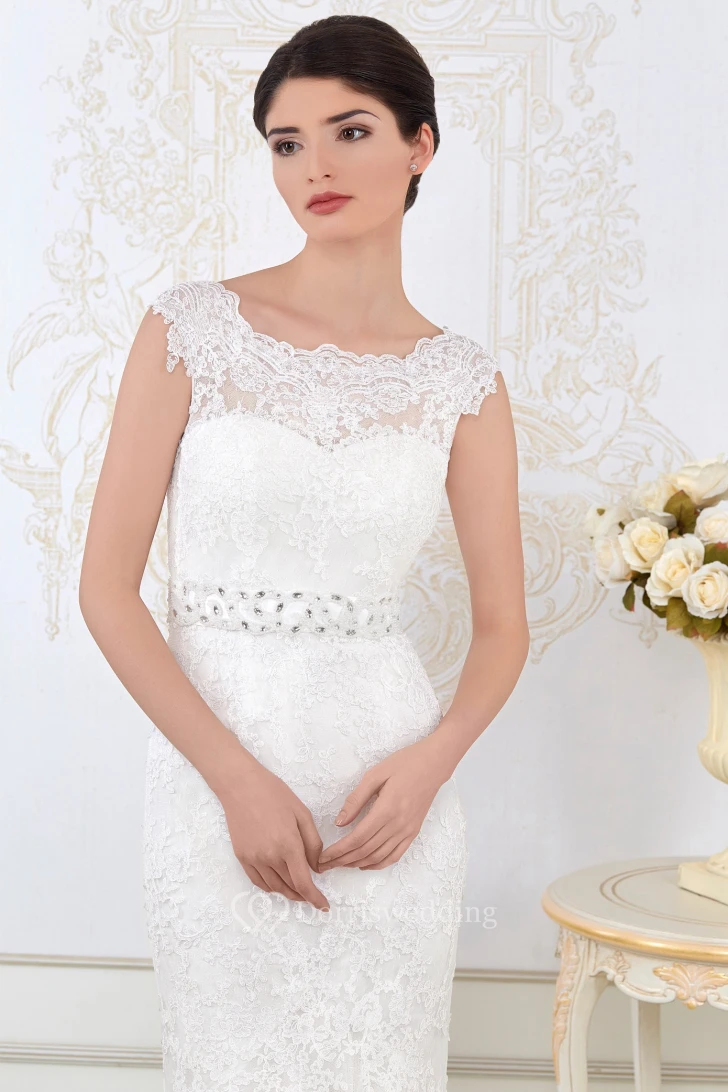 Sheath Bateau-Neck Appliqued Long Cap-Sleeve Lace Wedding Dress With Waist Jewellery