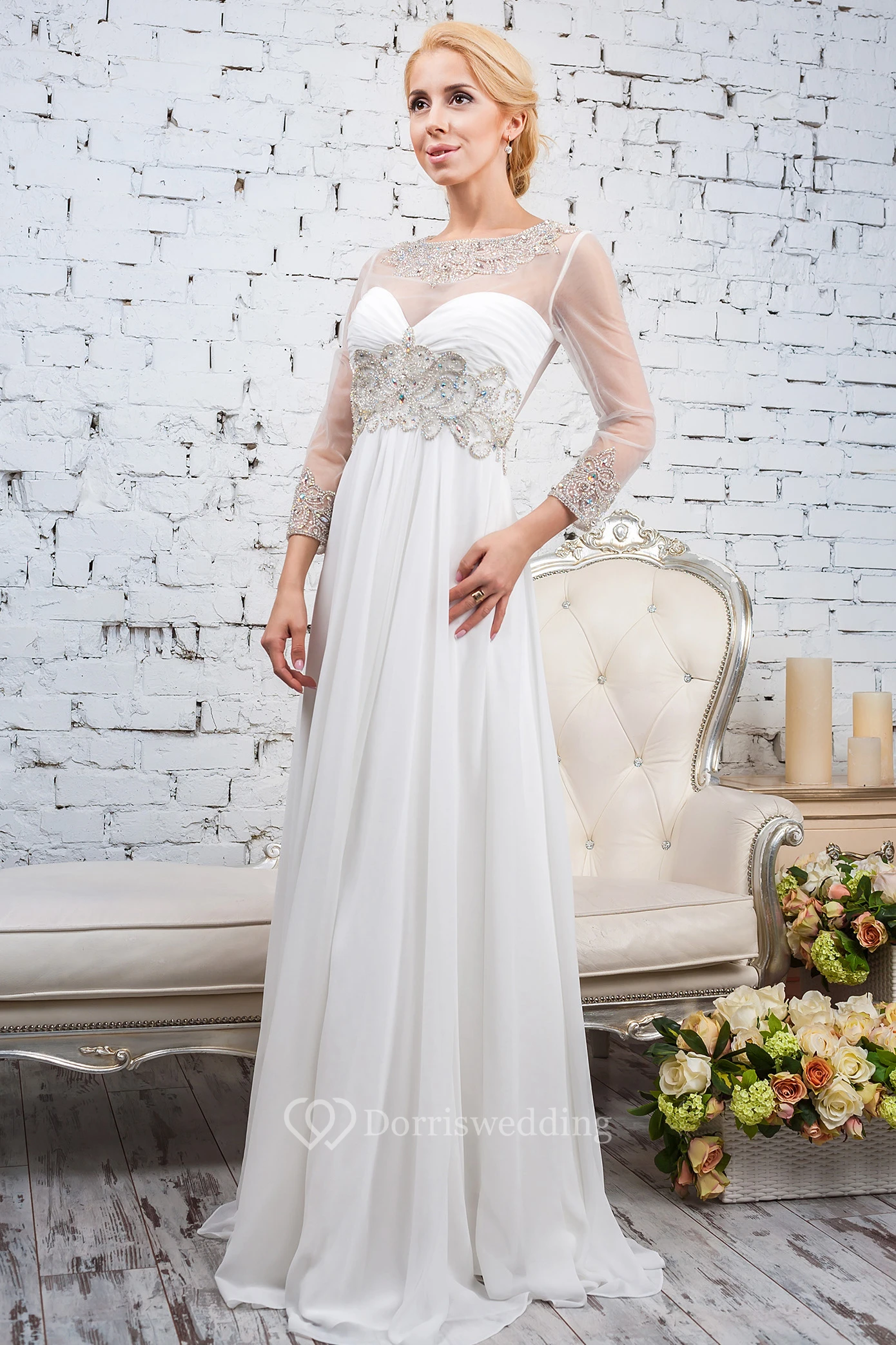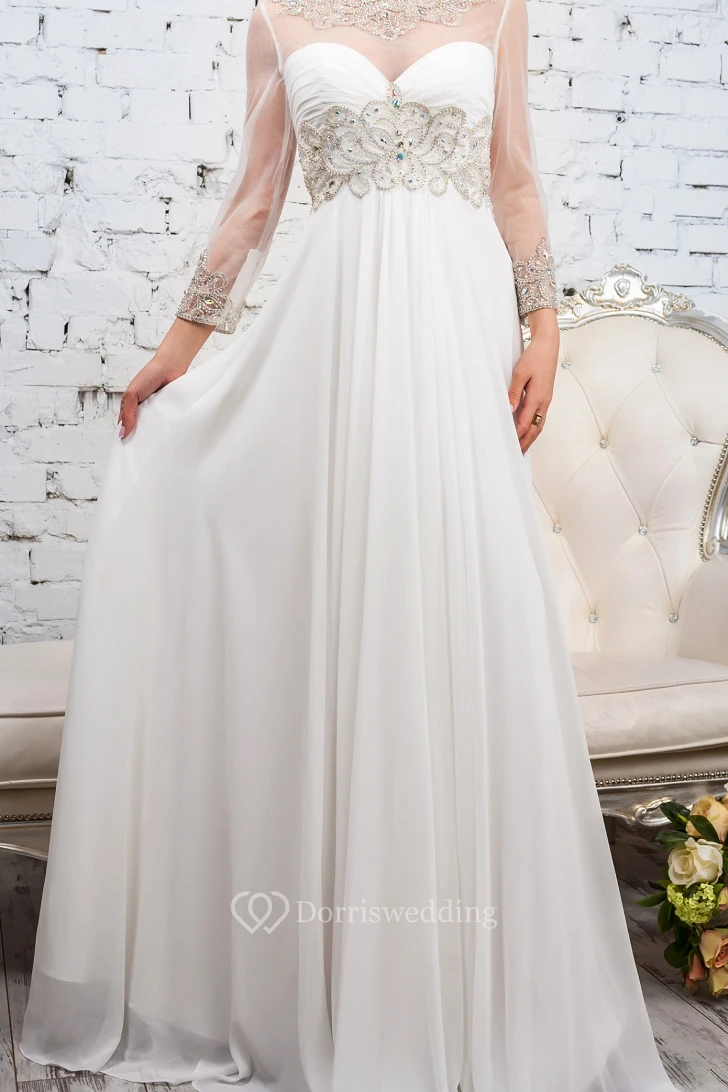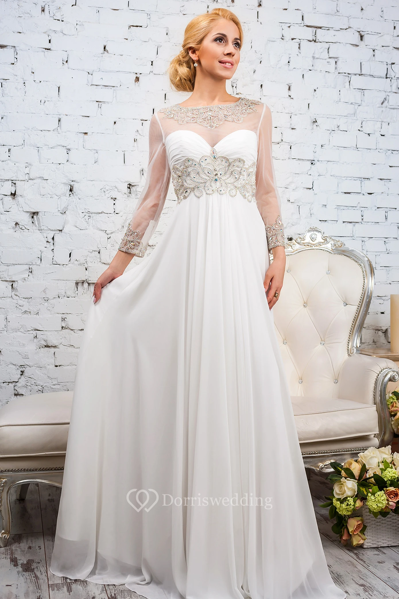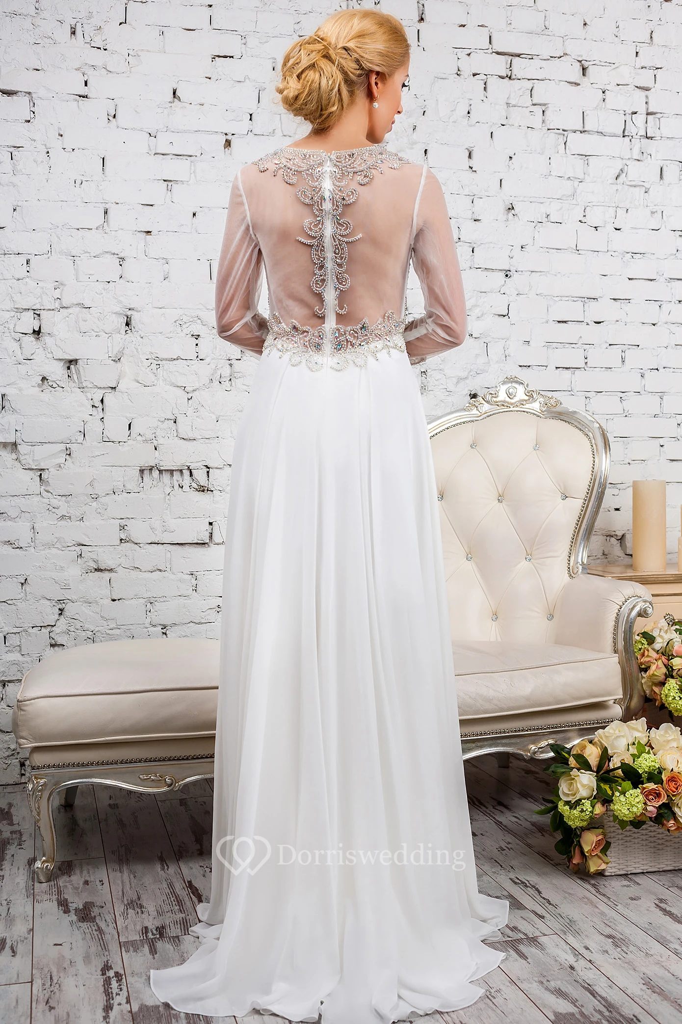 Sheath Bateau-Neck Floor-Length Beaded Long-Sleeve Tulle&Satin Wedding Dress With Pleats