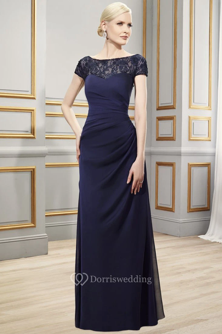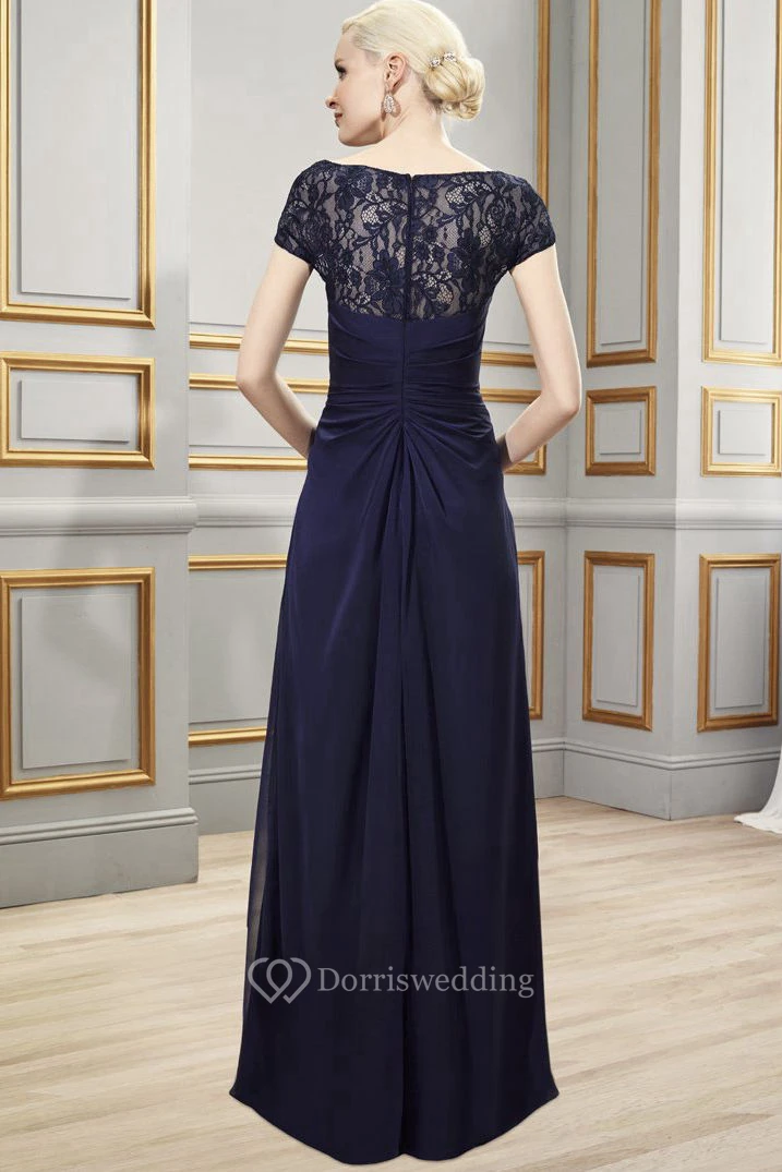 Sheath Bateau Short-Sleeve Appliqued Long Chiffon Formal Dress With Illusion Back And Side Draping