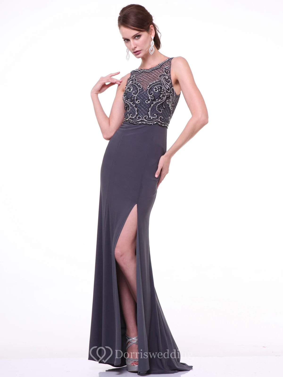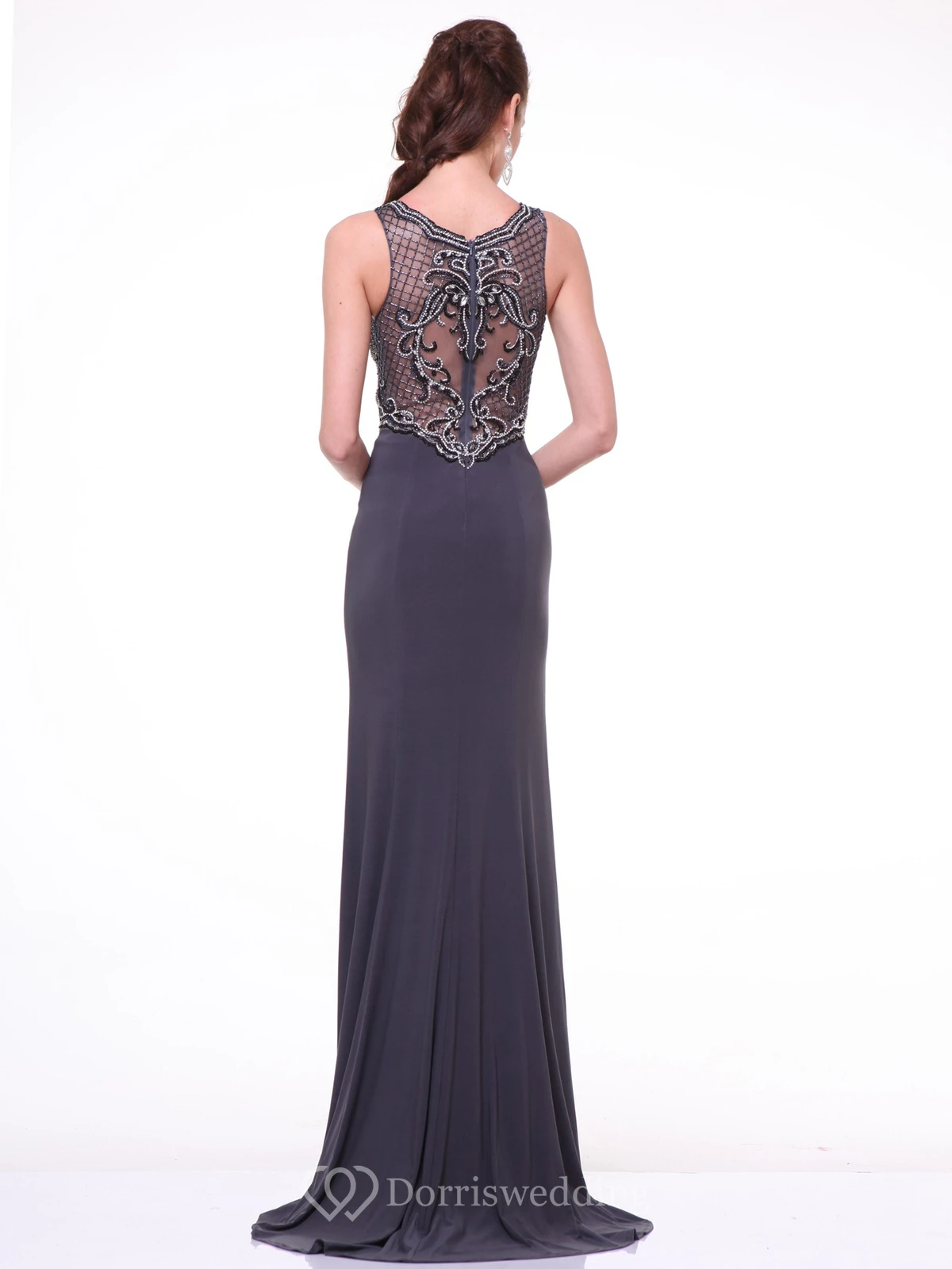 Sheath Bateau Sleeveless Jersey Illusion Dress With Split Front And Beading