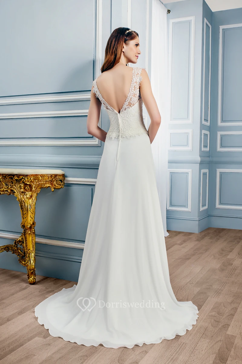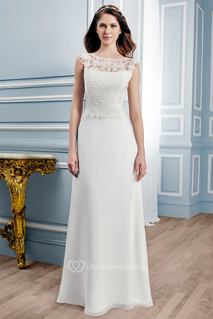 Sheath Bateau Sleeveless Maxi Appliqued Lace Wedding Dress With Sweep Train And Deep-V Back