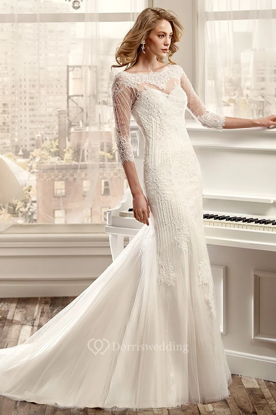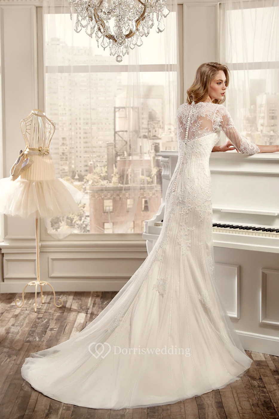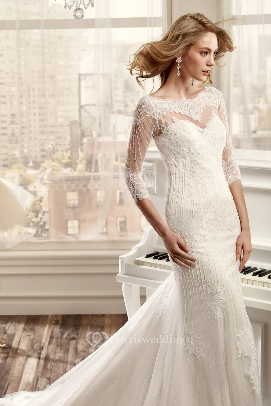 Sheath Beaded Bateau Long 3-4-Sleeve Tulle Wedding Dress With Appliques And Illusion Back