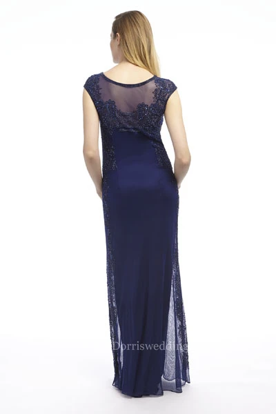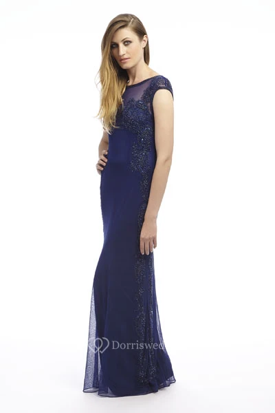 Sheath Beaded Bateau-Neck Long Cap-Sleeve Tulle&Satin Prom Dress