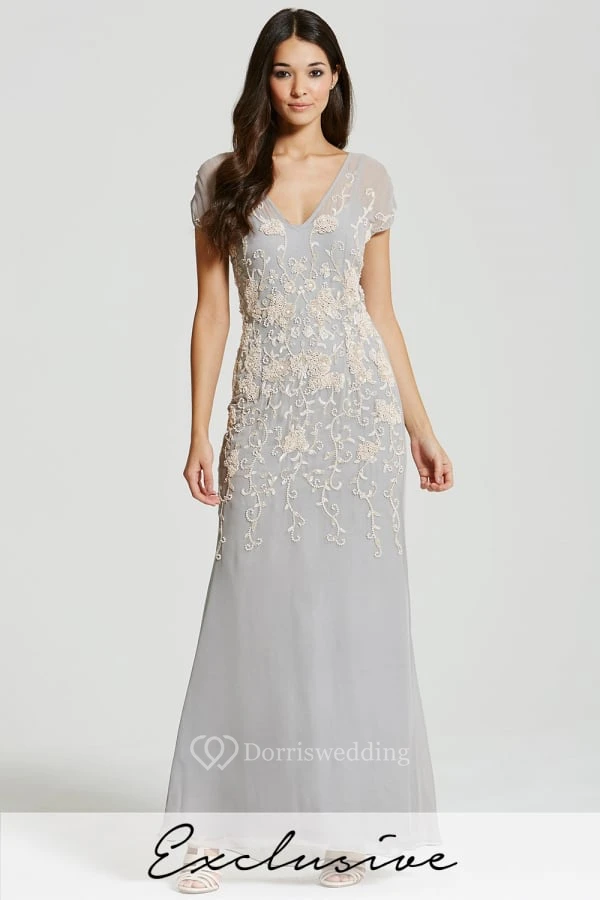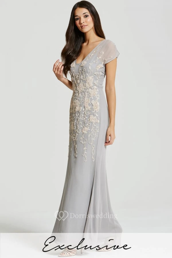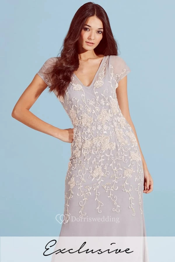 Sheath Beaded Cap Sleeve V-Neck Chiffon Bridesmaid Dress