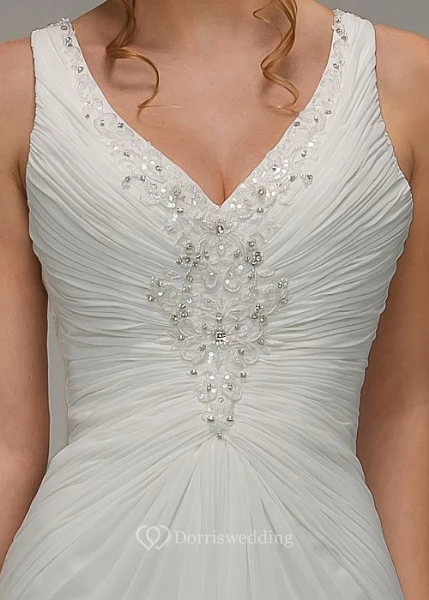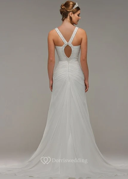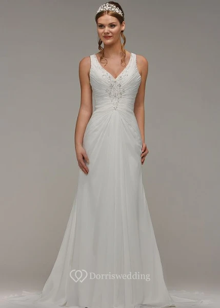 Sheath Beaded Floor-Length V-Neck Sleeveless Chiffon Wedding Dress With Ruching And Keyhole