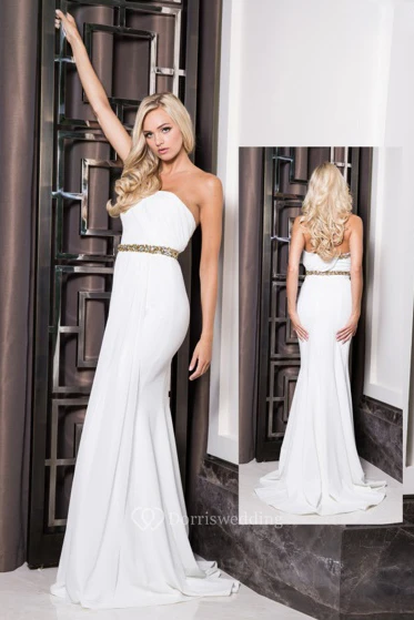 Sheath Beaded Long Sleeveless Strapless Chiffon Prom Dress With Backless Style And Pleats
