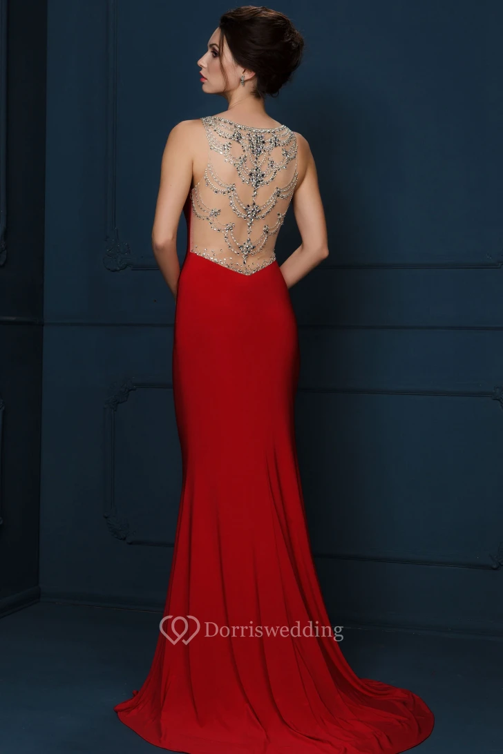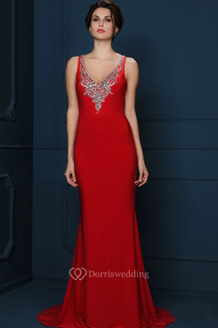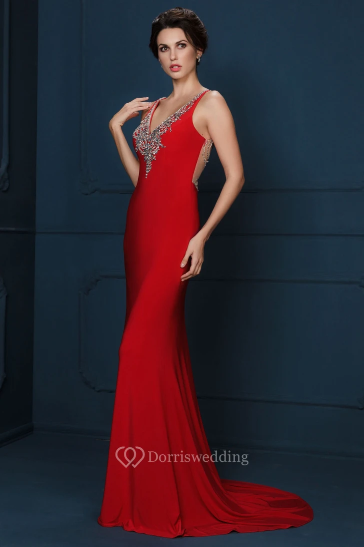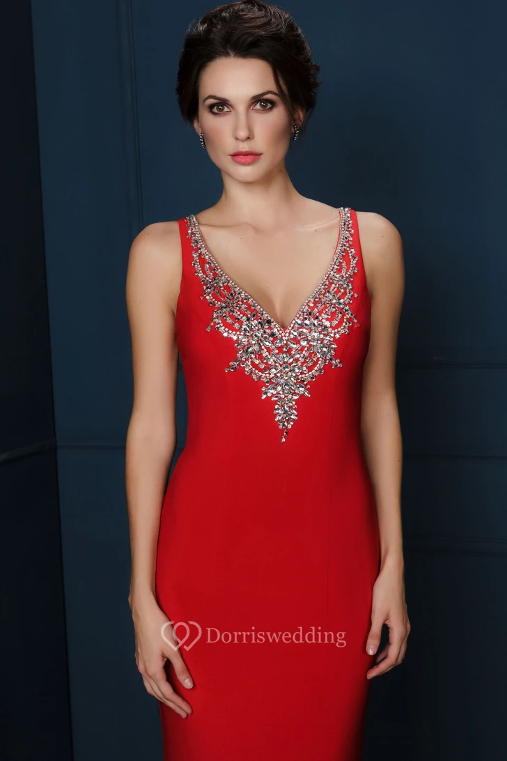Sheath Beaded Sleeveless Long V-Neck Jersey Evening Dress