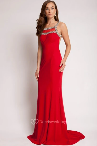 Sheath Beaded Square Sleeveless Long Jersey Prom Dress With Backless Style And Brush Train