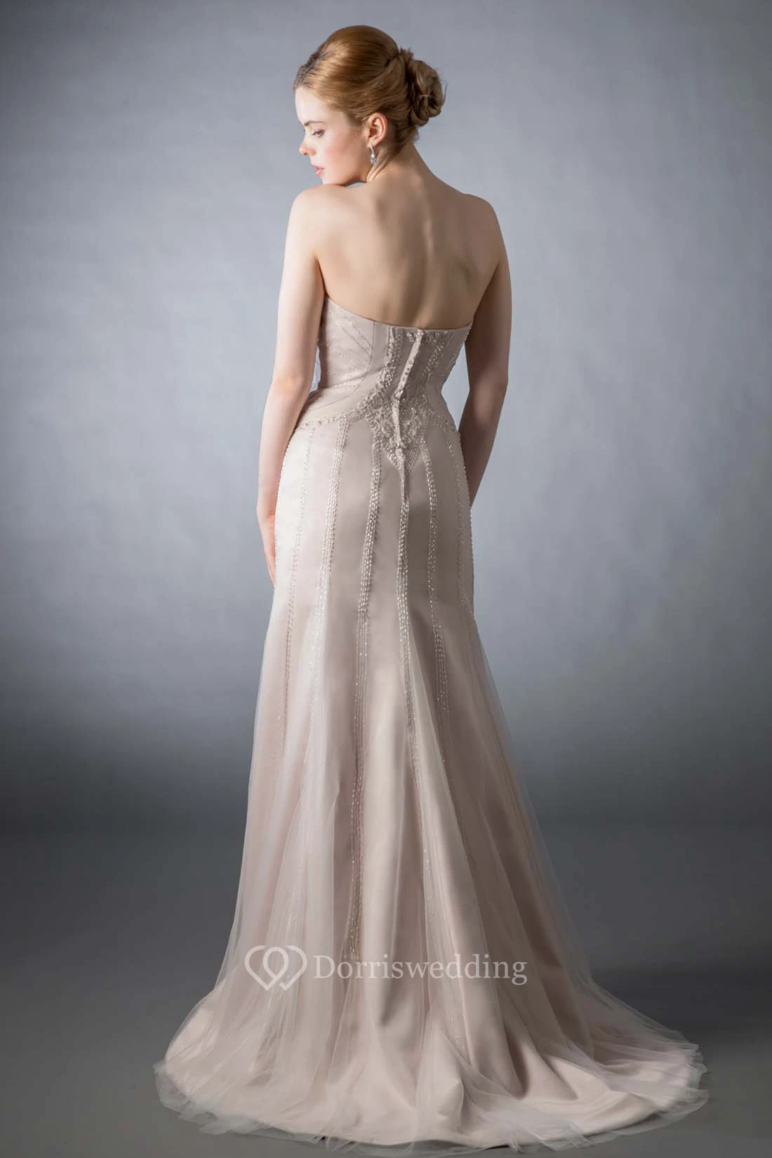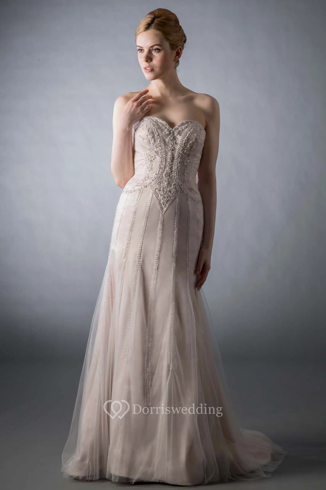 Sheath Beaded Sweetheart Sleeveless Tulle Wedding Dress With Brush Train