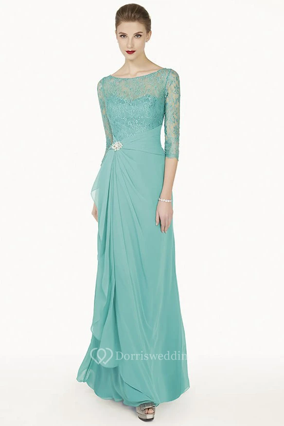 Sheath Broach Floor-Length Scoop-Neck Half-Sleeve Chiffon Prom Dress With Draping And Lace