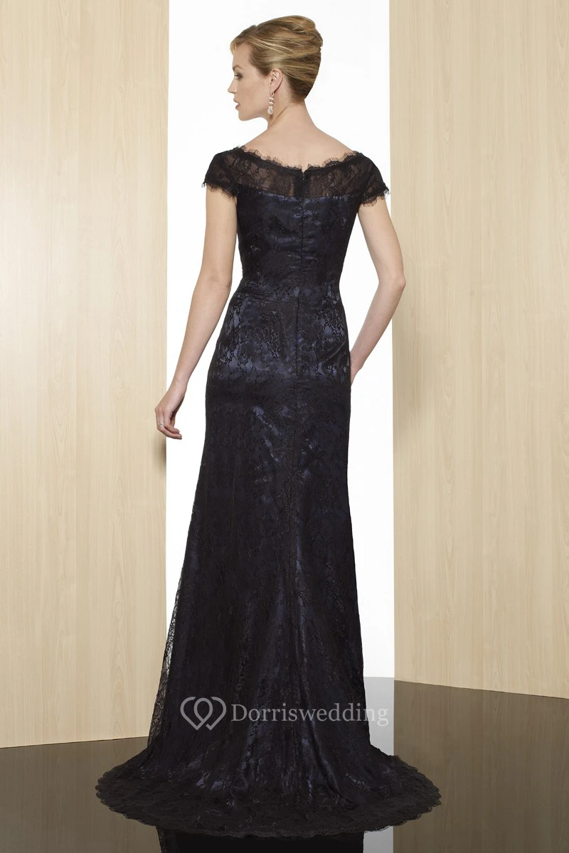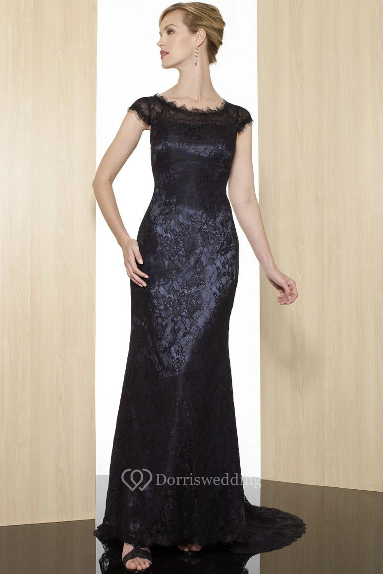 Sheath Cap-Short-Sleeve Appliqued Scoop Maxi Lace Formal Dress With Zipper Back And Sweep Train