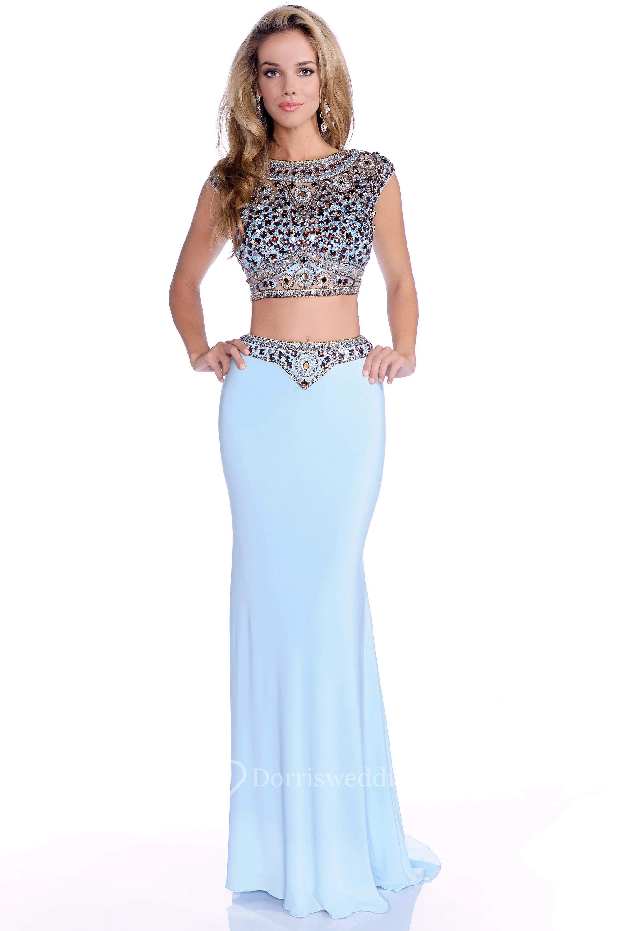 Sheath Cap Sleeve Crop Top Jersey Prom Dress With Jeweled Bodice