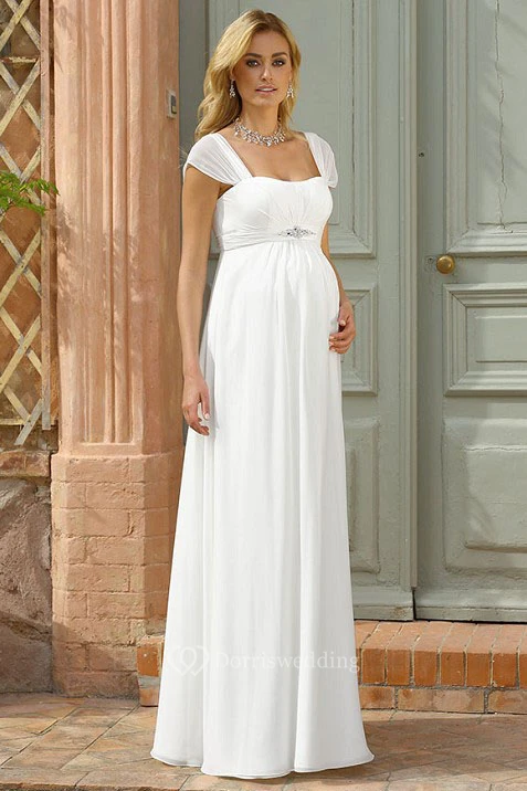 Sheath Cap Sleeve Empire Square Neck Jeweled Chiffon Wedding Dress