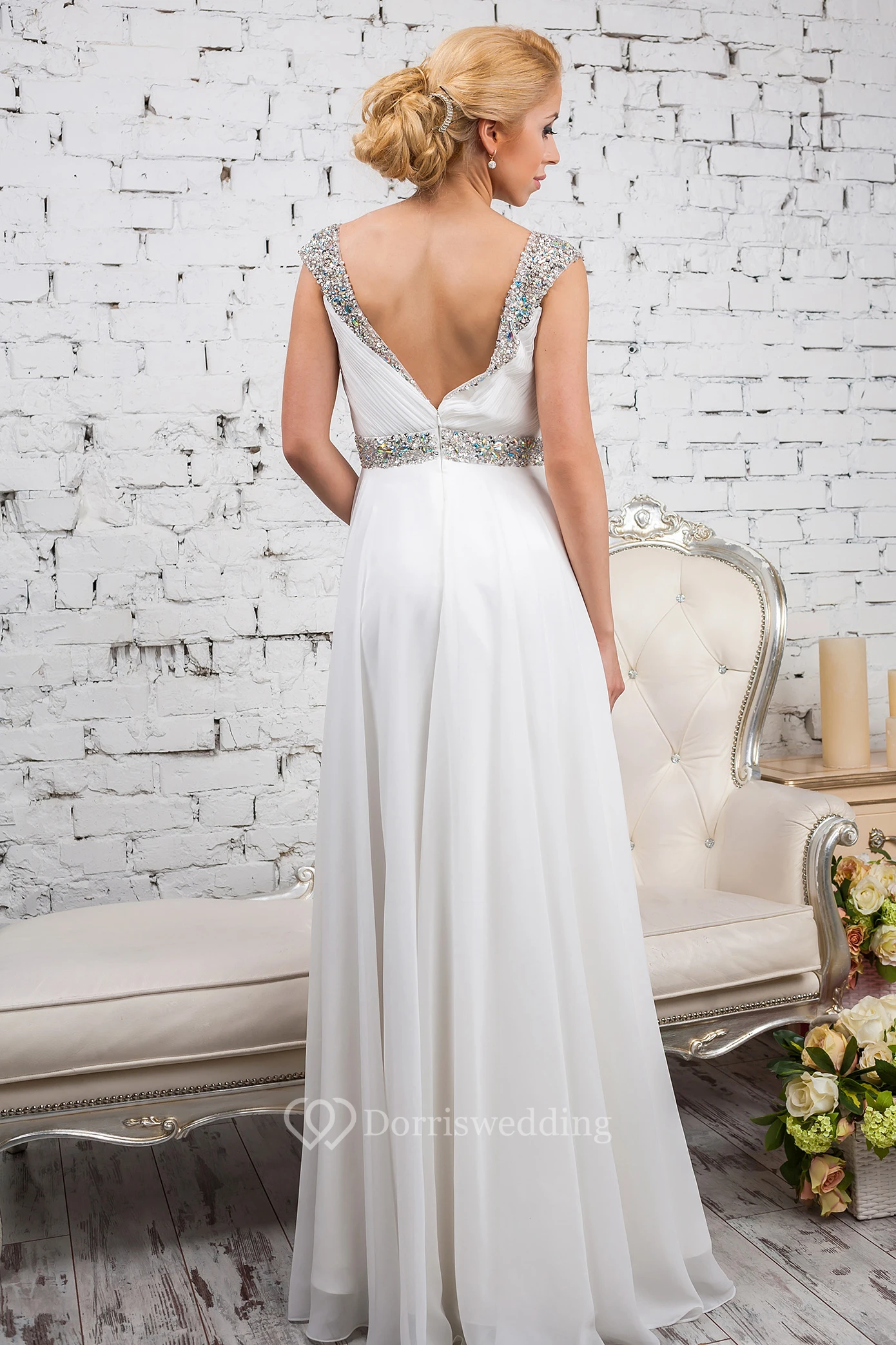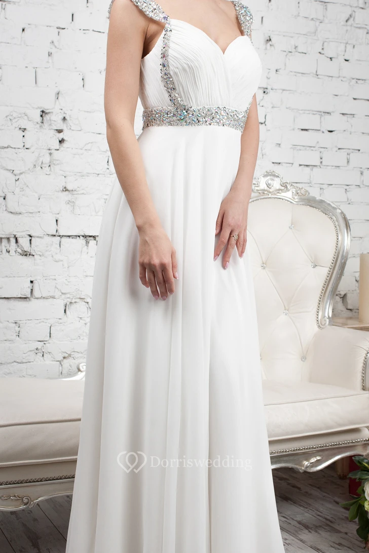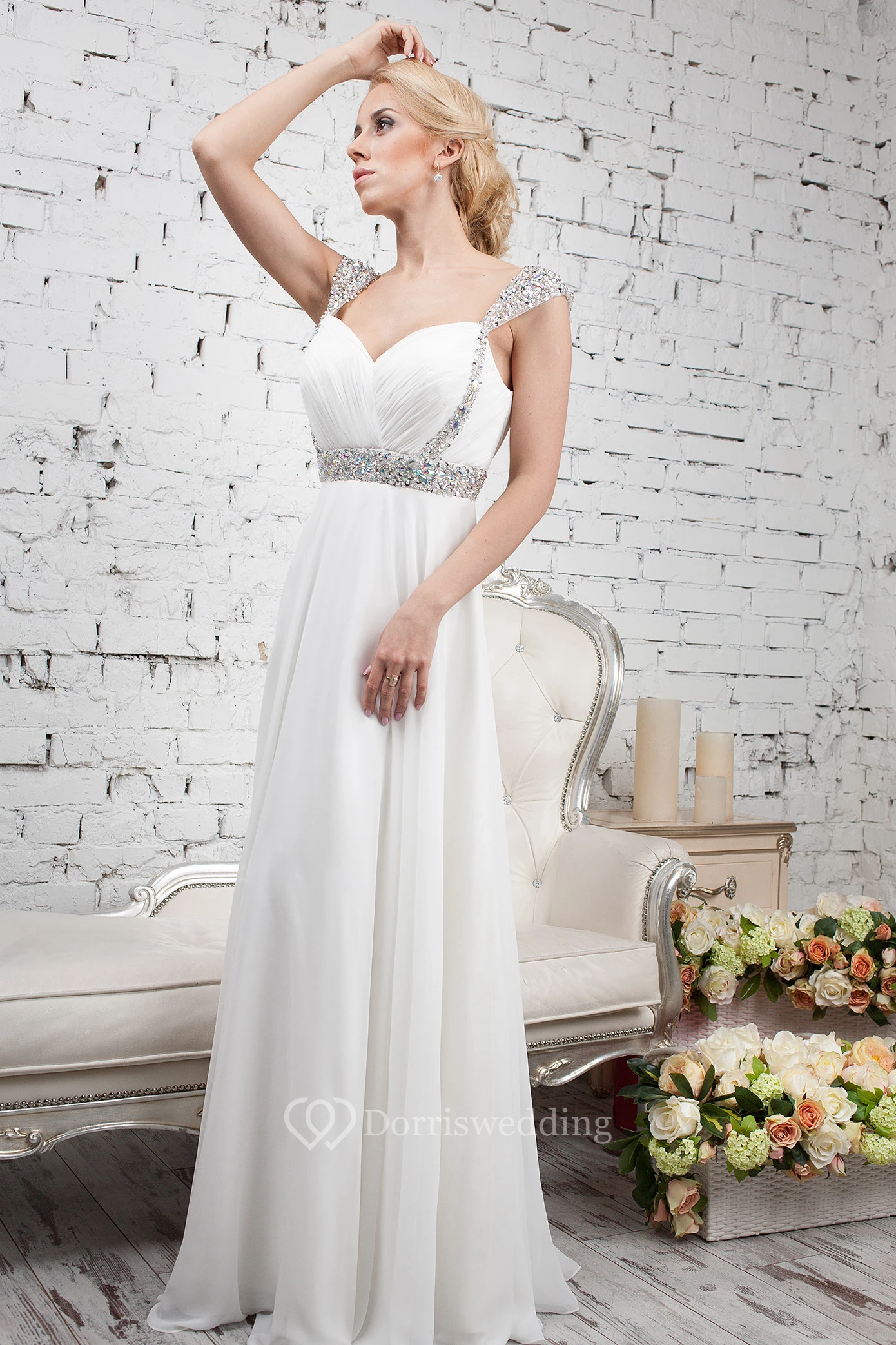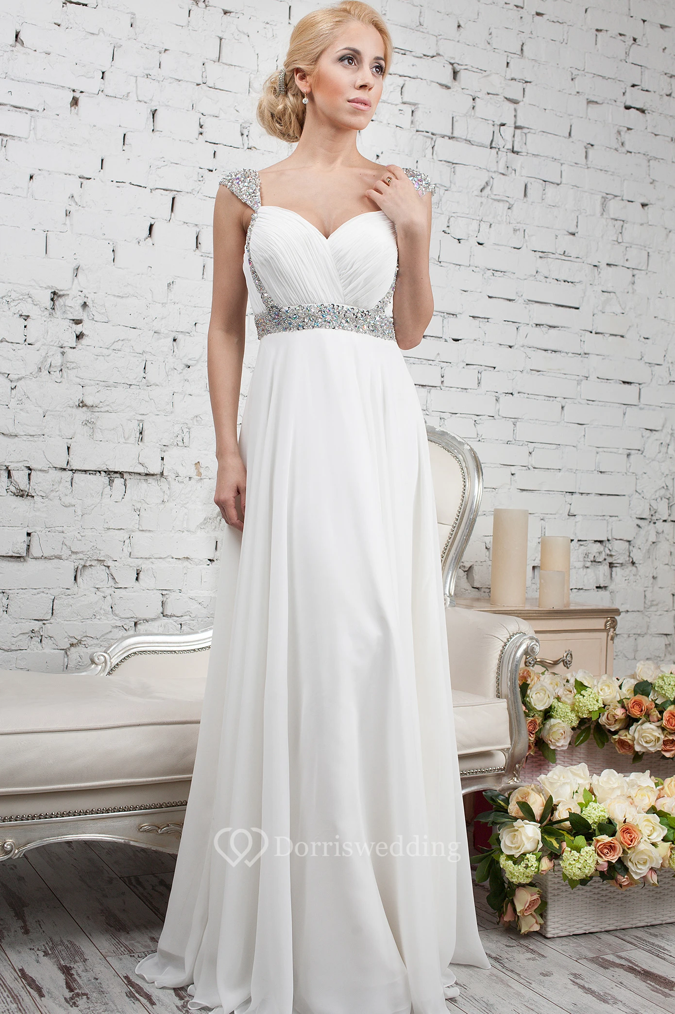 Sheath Cap-Sleeve Floor-Length Beaded Chiffon Wedding Dress With Ruching
