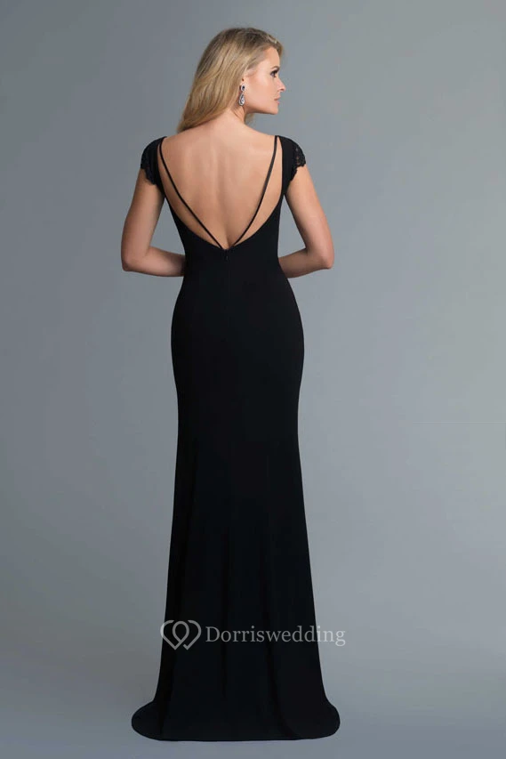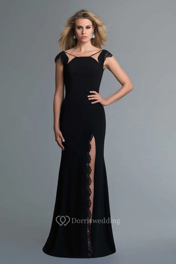 Sheath Cap-Sleeve Jersey Deep-V Back Dress With Split Front And Lace