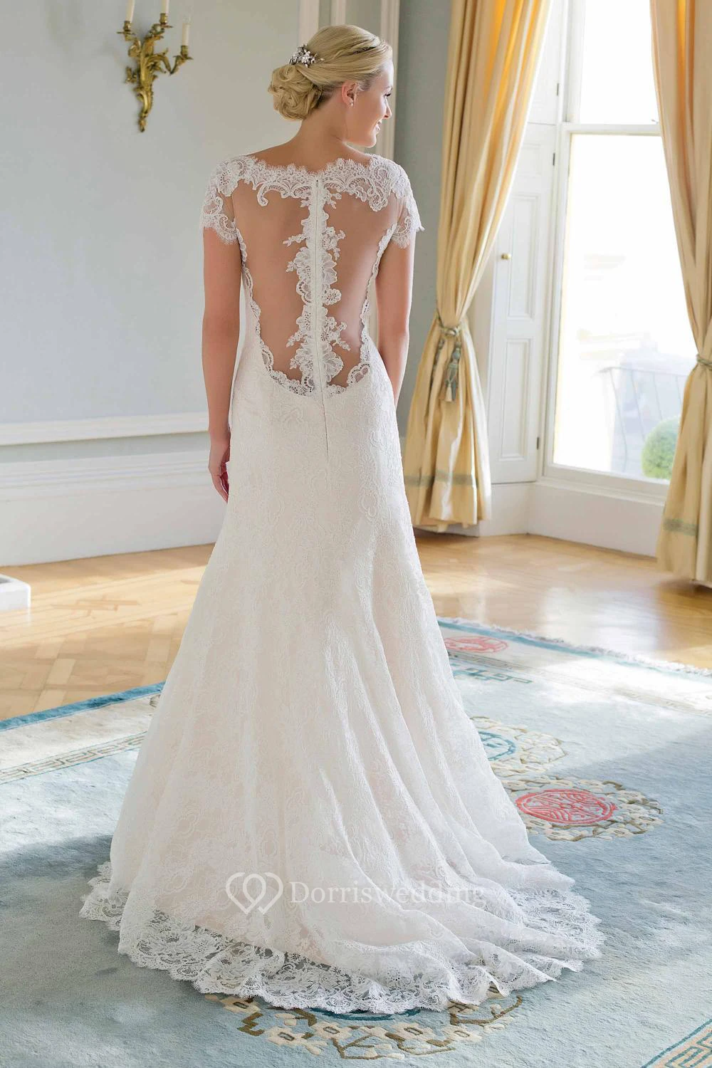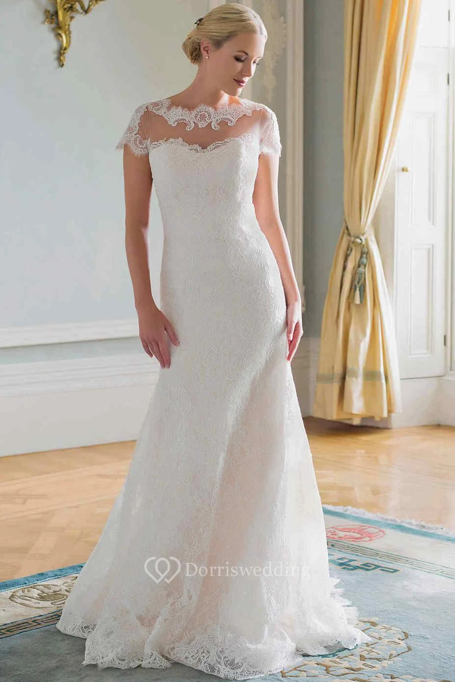 Sheath Cap-Sleeve Jewel-Neck Lace Wedding Dress With Illusion