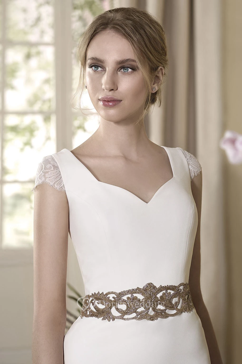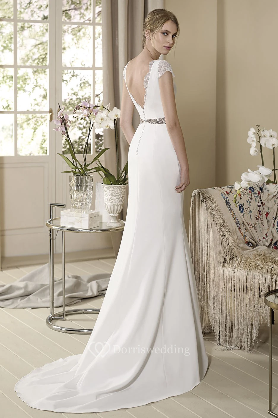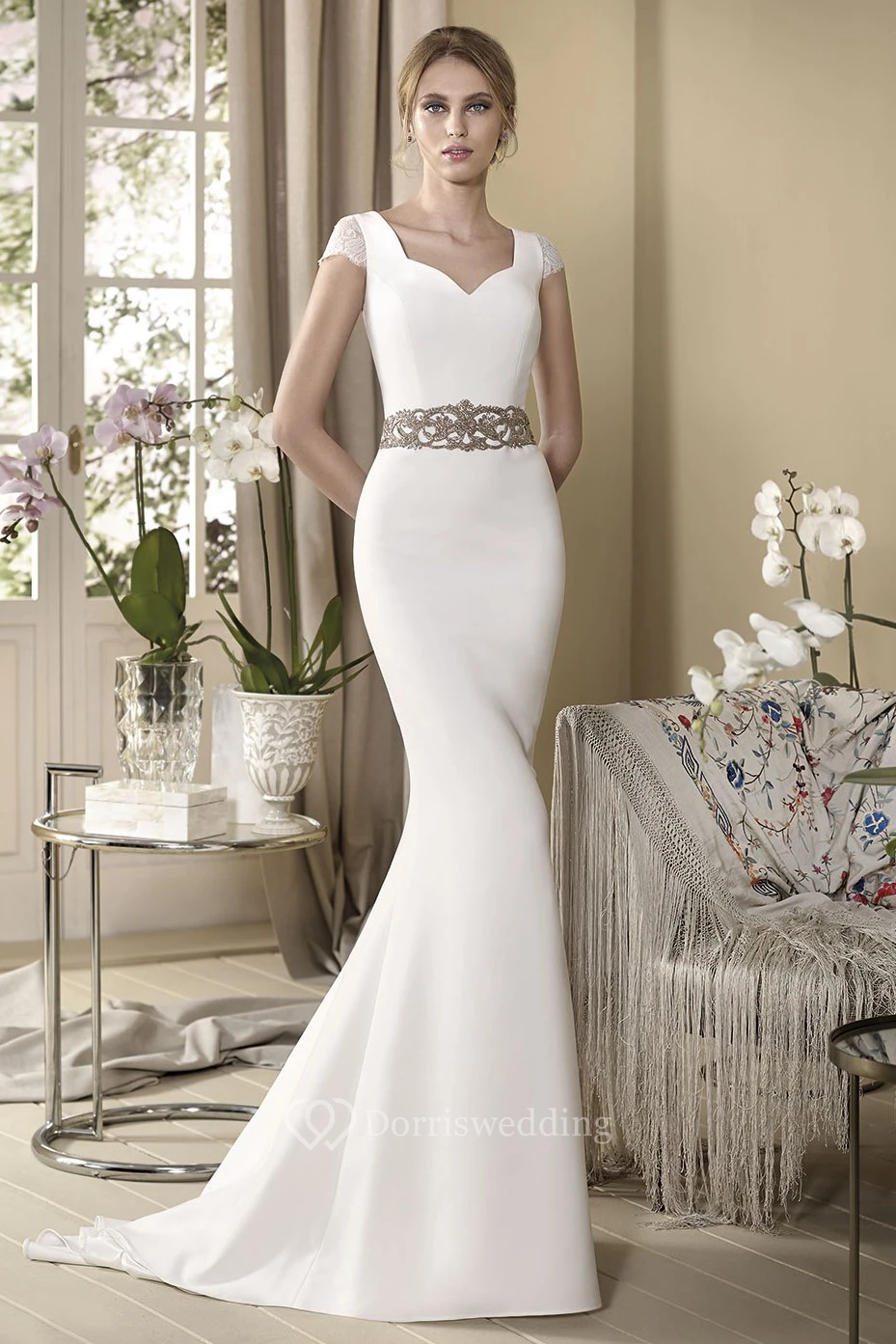 Sheath Cap-Sleeve Jeweled V-Neck Floor-Length Wedding Dress