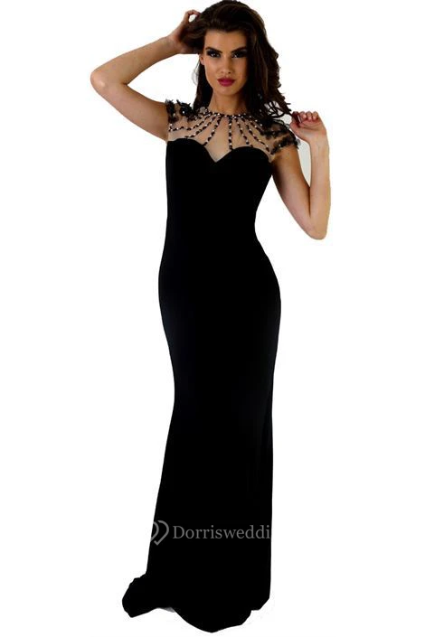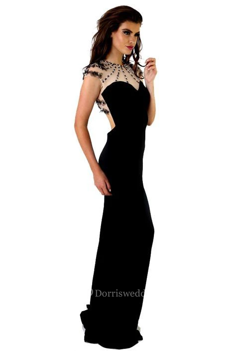 Sheath Cap-Sleeve Maxi Jewel Beaded Jersey Prom Dress With Keyhole Back And Flower
