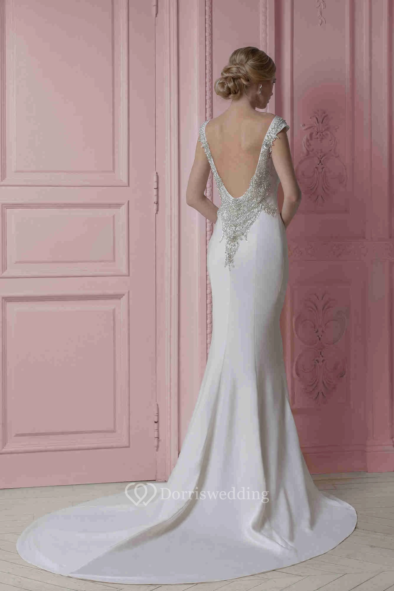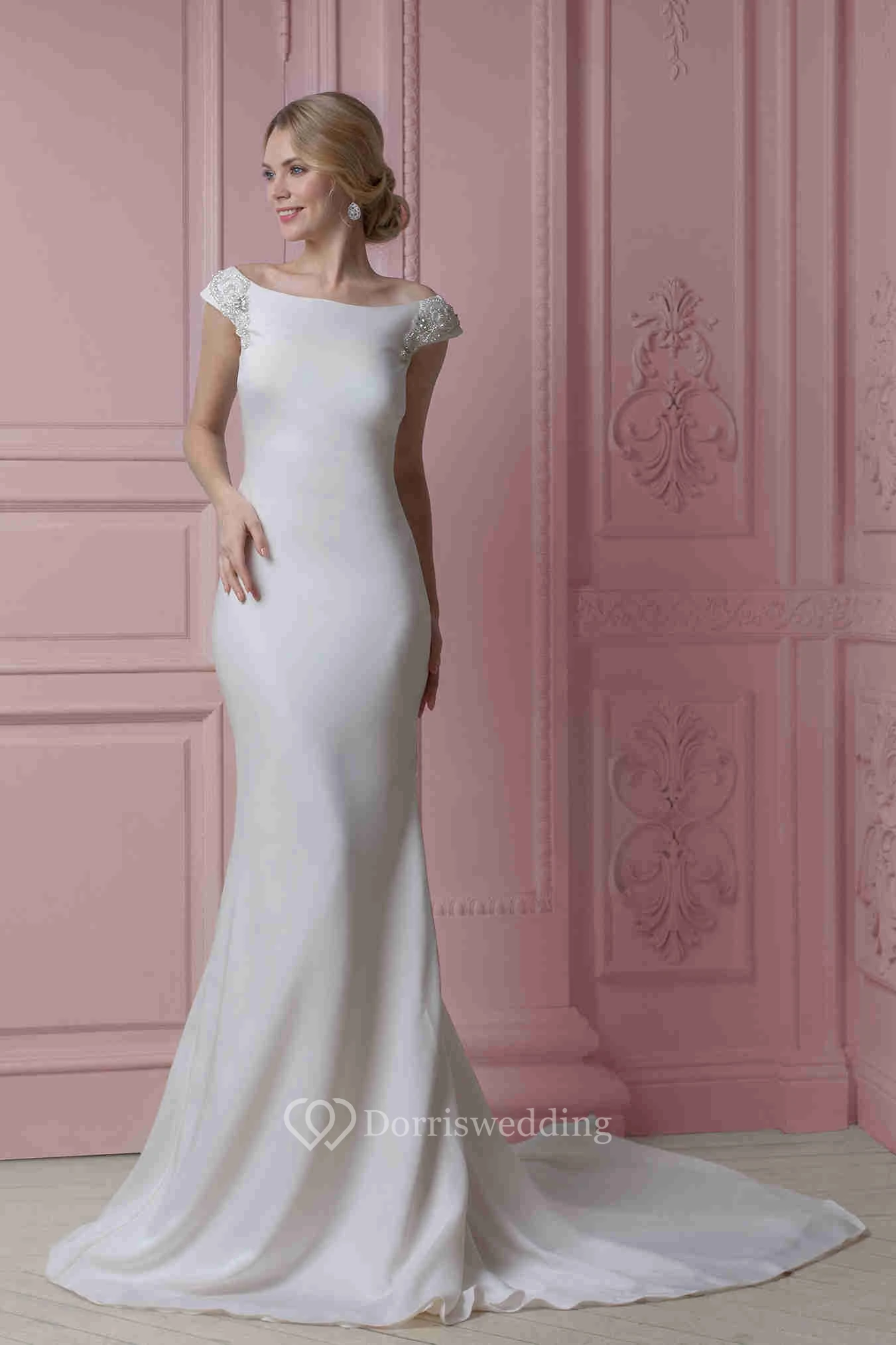Sheath Cap-Sleeve Off-The-Shoulder Chiffon Wedding Dress With Beading And Deep-V Back