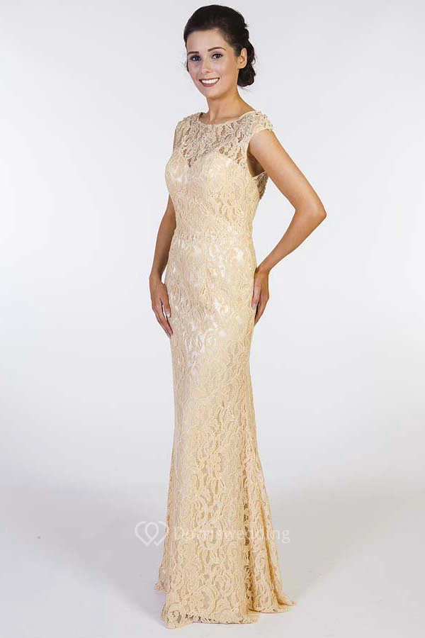 Sheath Cap Sleeve Scoop Neck Beaded Lace Prom Dress