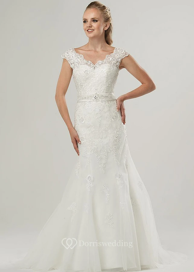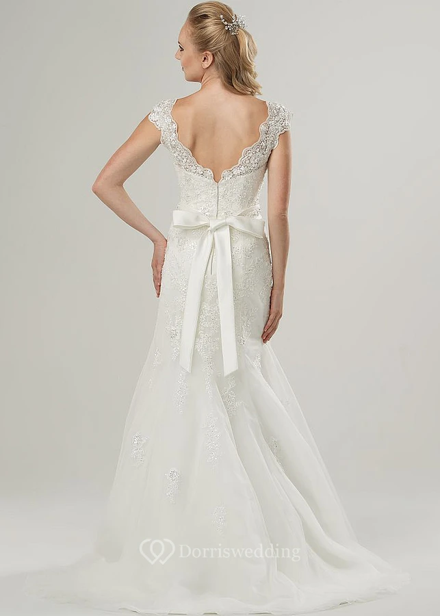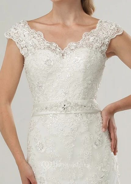 Sheath Cap-Sleeve V-Neck Jeweled Lace Wedding Dress With Bow