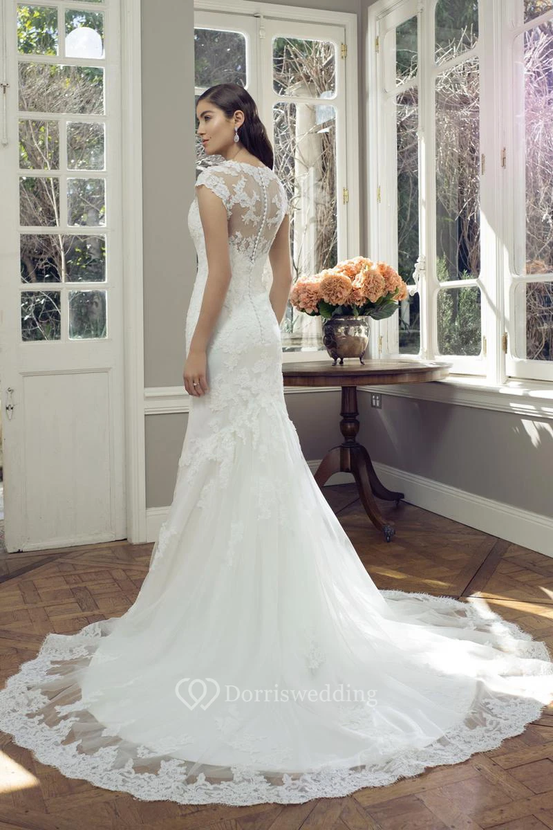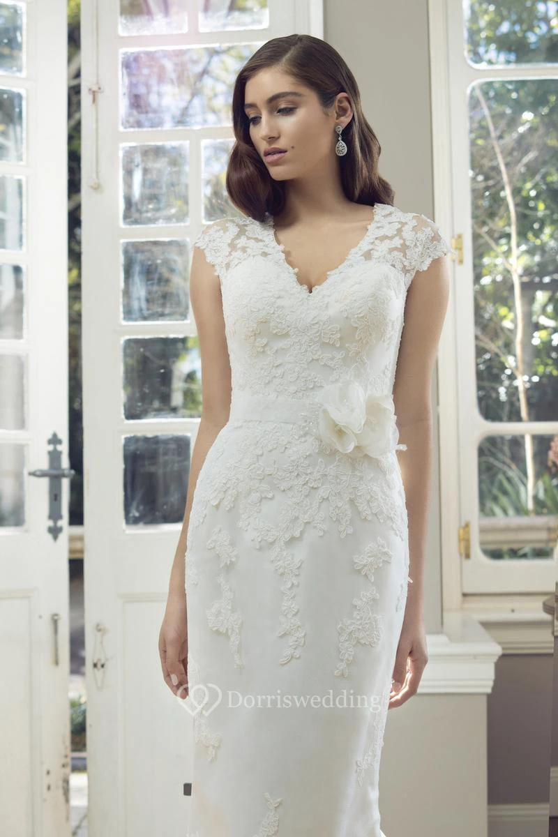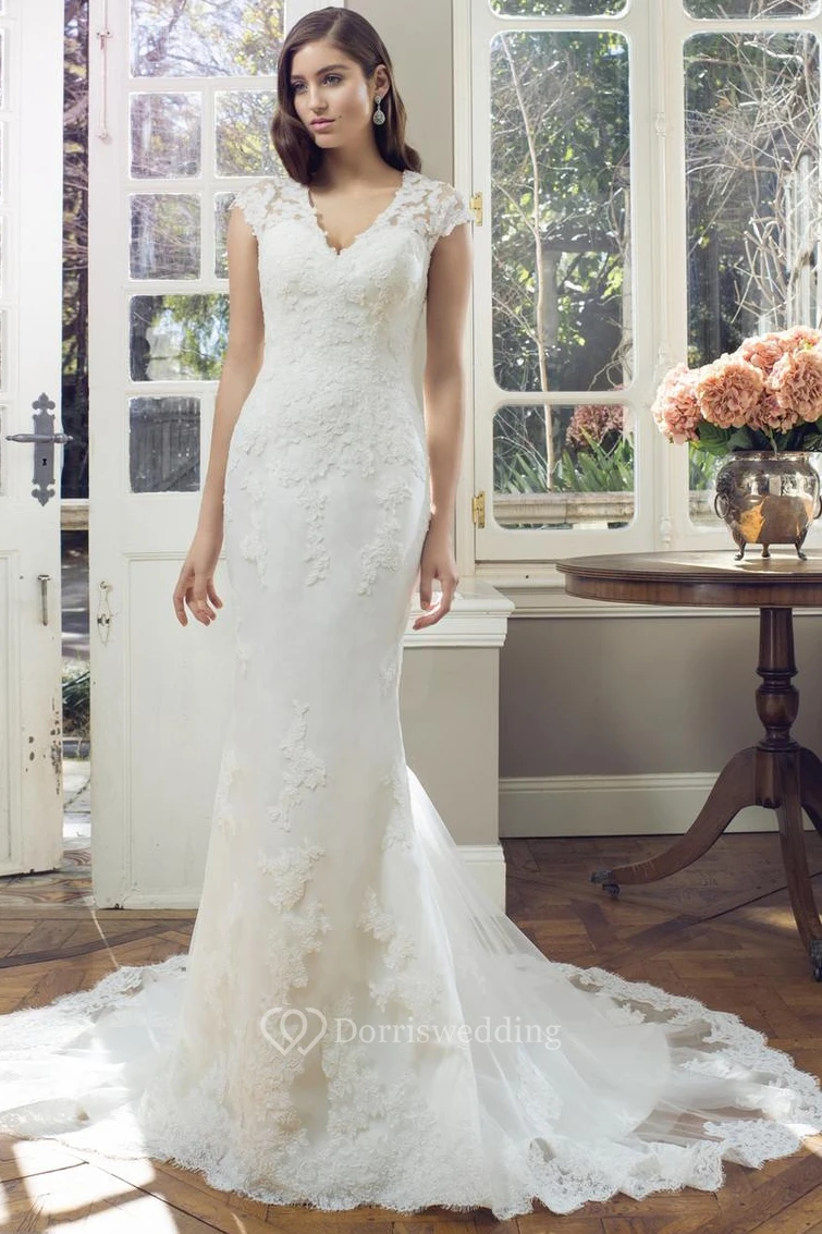 Sheath Cap-Sleeve V-Neck Lace Wedding Dress Styles With Illusion