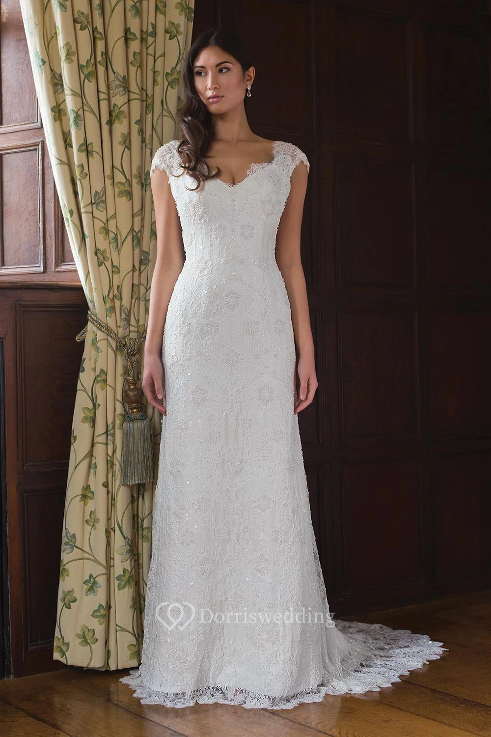 Sheath Cap-Sleeve V-Neck Lace Wedding Dress With Sweep Train