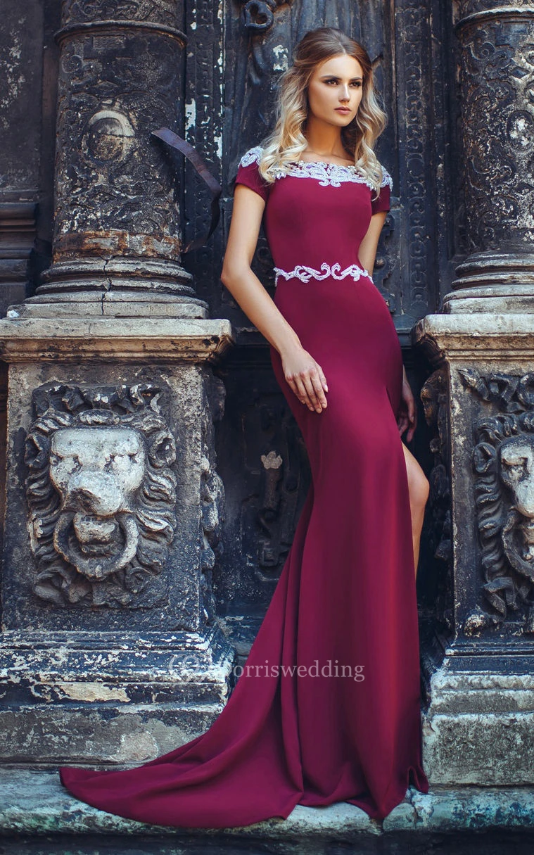 Sheath Court Train Bateau Short Sleeve Jersey Pleats Split Front Zipper Dress
