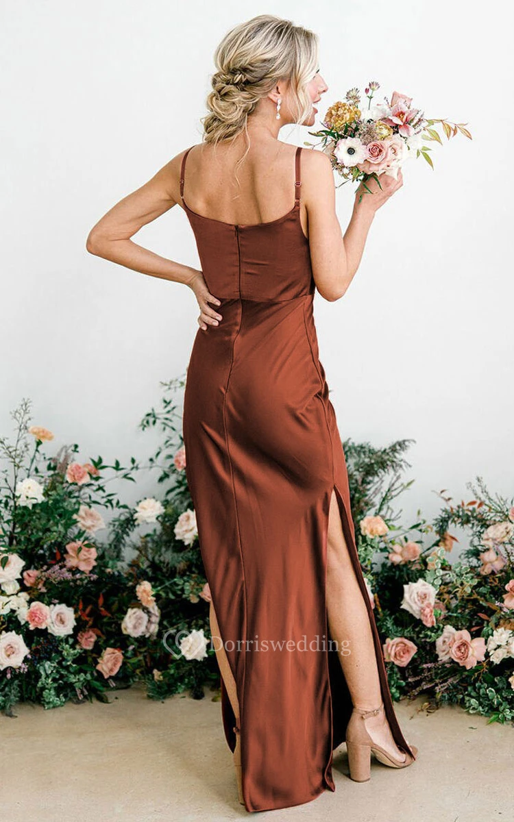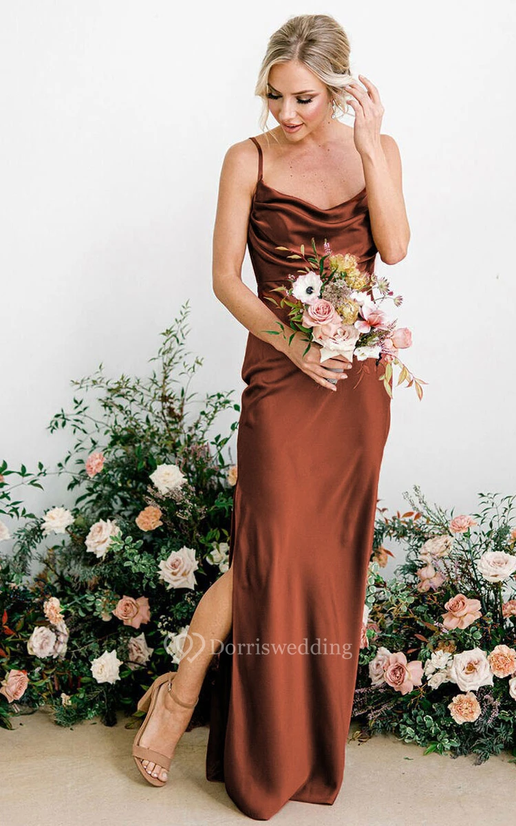 Sheath Cowl Neck Sleeveless Floor-length Charmeuse Bridesmaid Dress with Side Slits