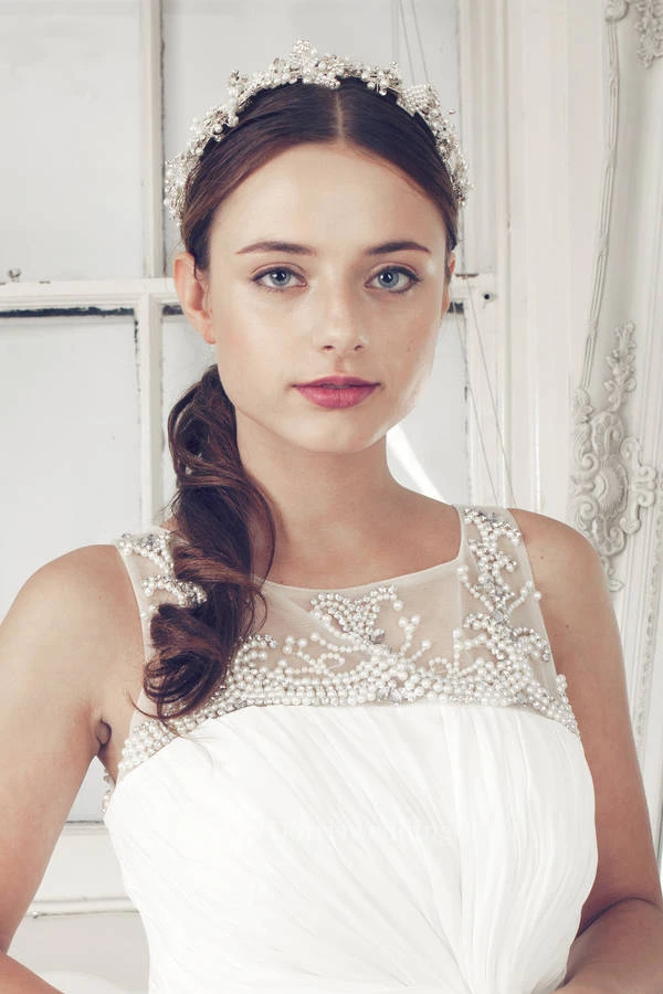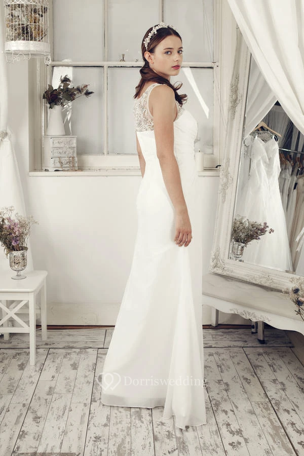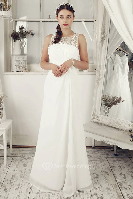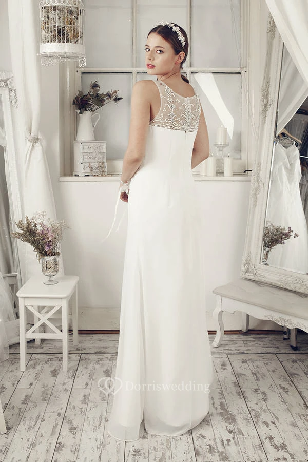 Sheath Empire Sleeveless Beaded Bateau Long Chiffon Wedding Dress With Illusion Back
