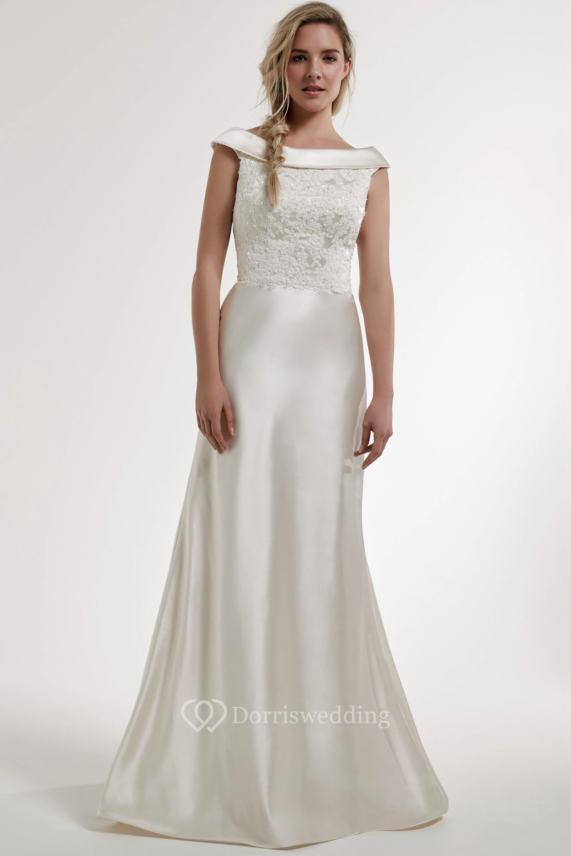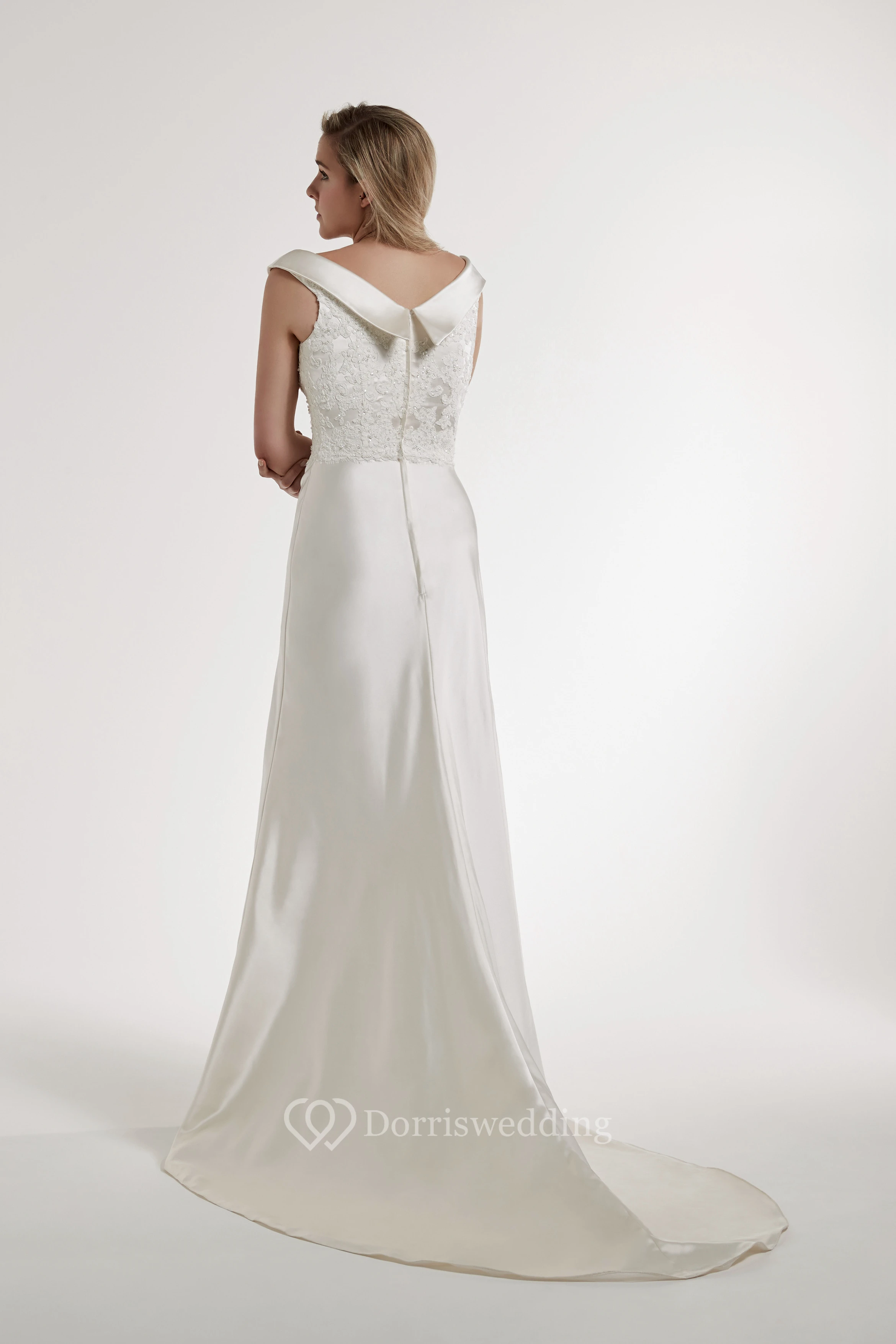 Sheath Floor-Length Appliqued Bateau Satin Wedding Dress With Low-V Back And Court Train