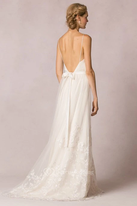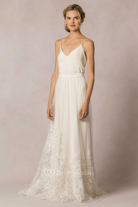 Sheath Floor-Length Appliqued Sleeveless Spaghetti Tulle&Lace Wedding Dress