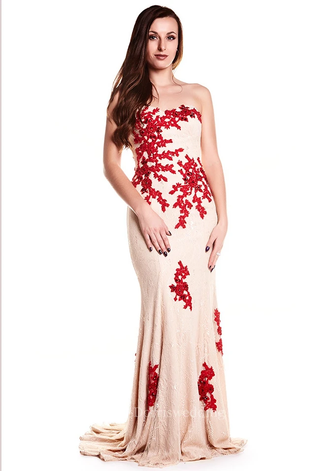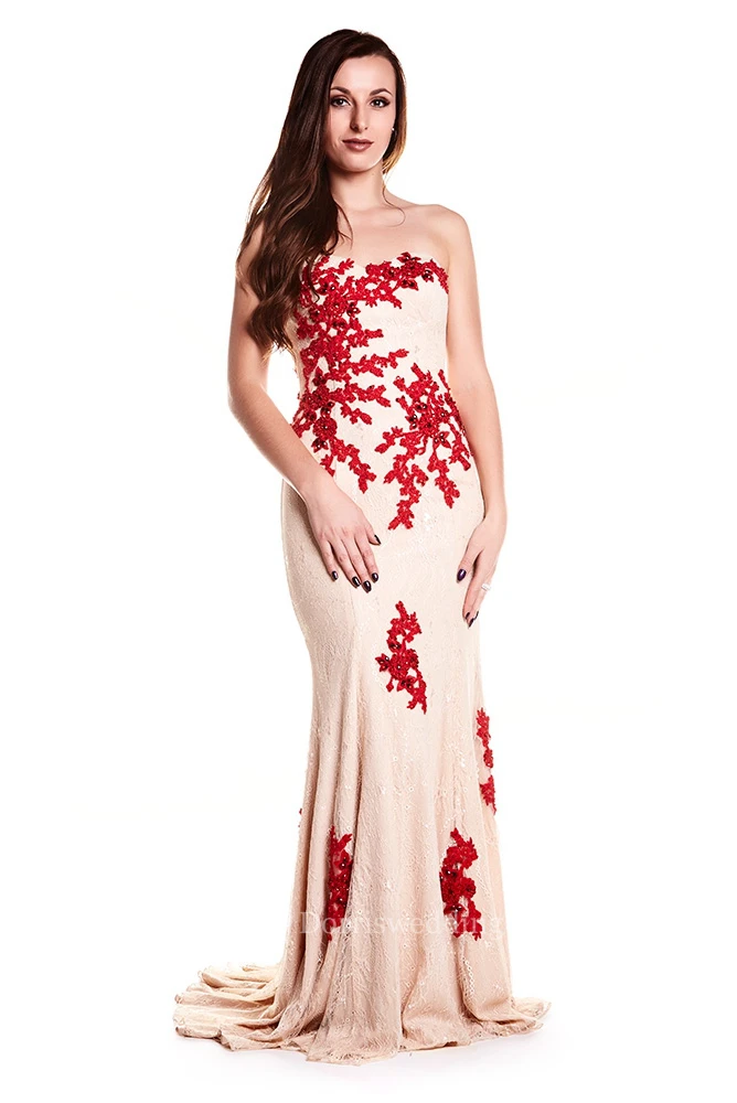 Sheath Floor-Length Appliqued Sleeveless Sweetheart Lace Prom Dress With Backless Style And Brush Train