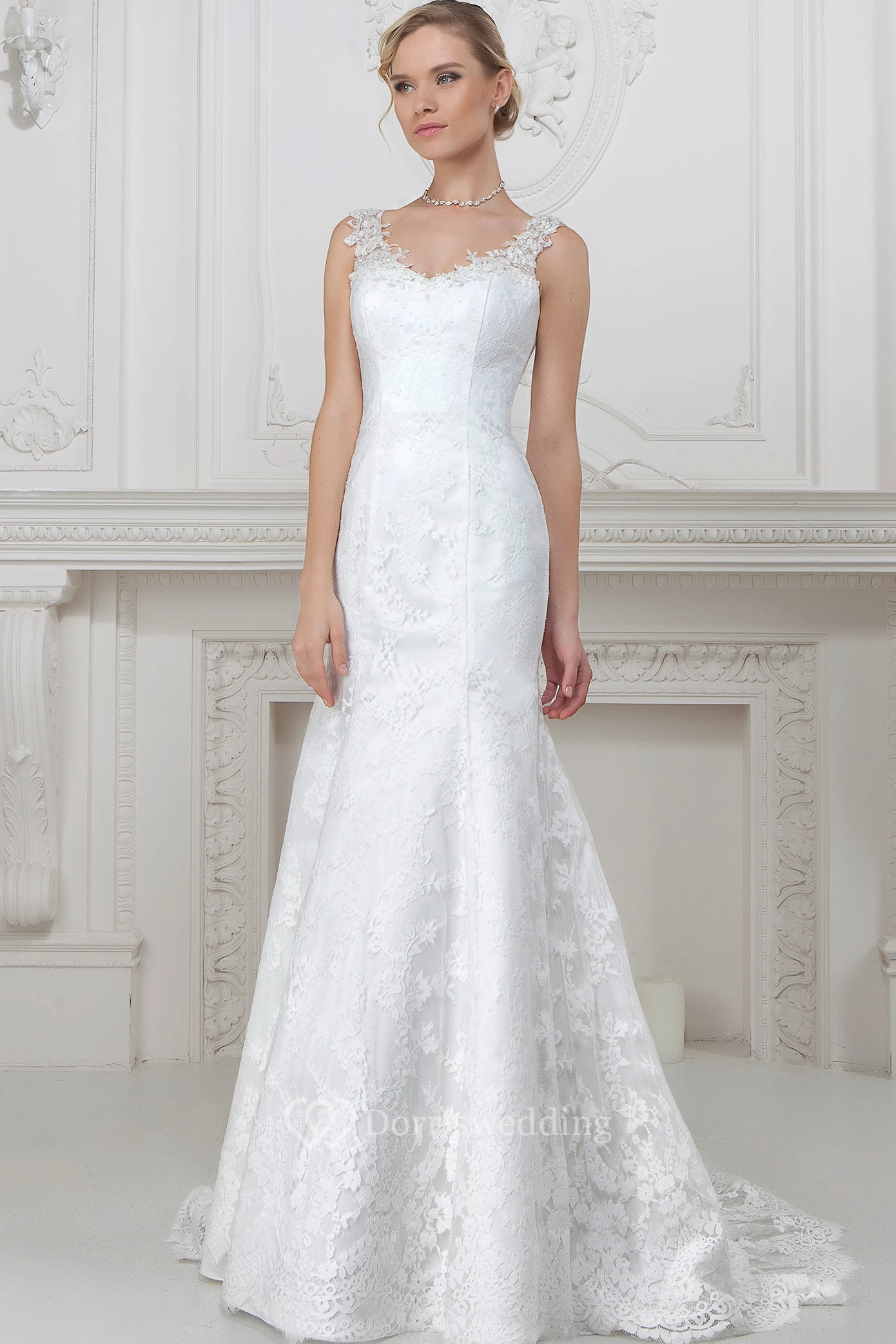 Sheath Floor-Length Appliqued Sleeveless V-Neck Lace Wedding Dress
