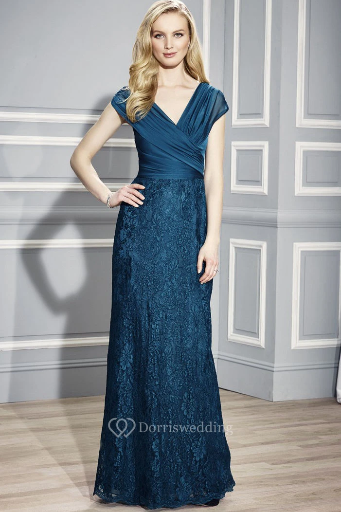 Sheath Floor-Length Appliqued V-Neck Lace Formal Dress With Low-V Back And Ruching