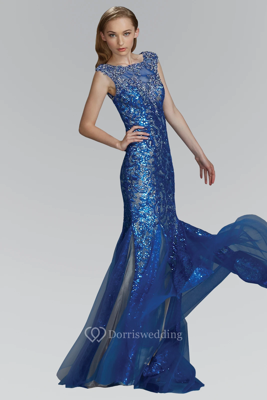Sheath Floor-Length Bateau Cap-Sleeve Sequins Tulle Dress With Beading