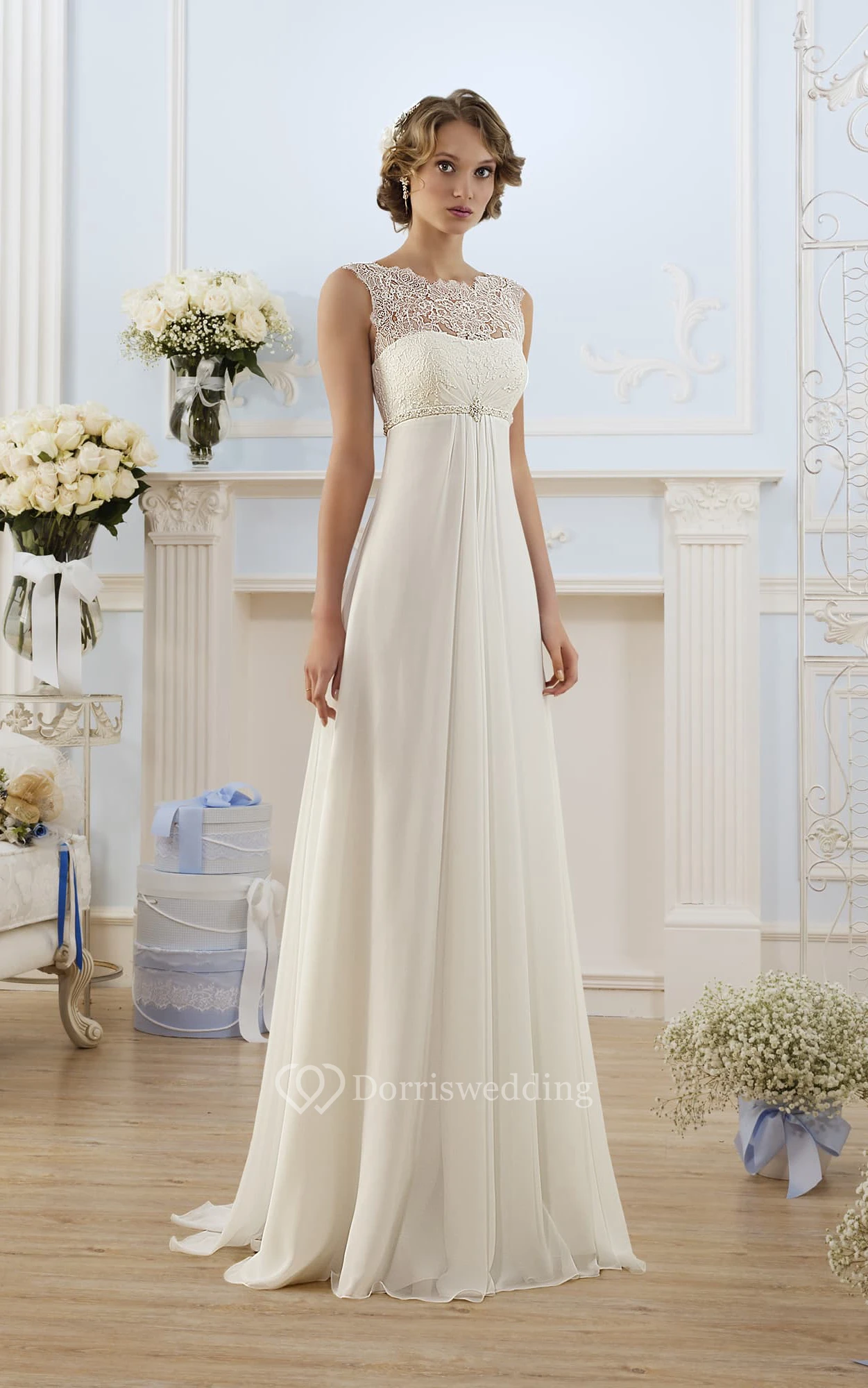 Sheath Floor-Length Bateau Sleeveless Empire Lace-Up Chiffon Dress With Lace