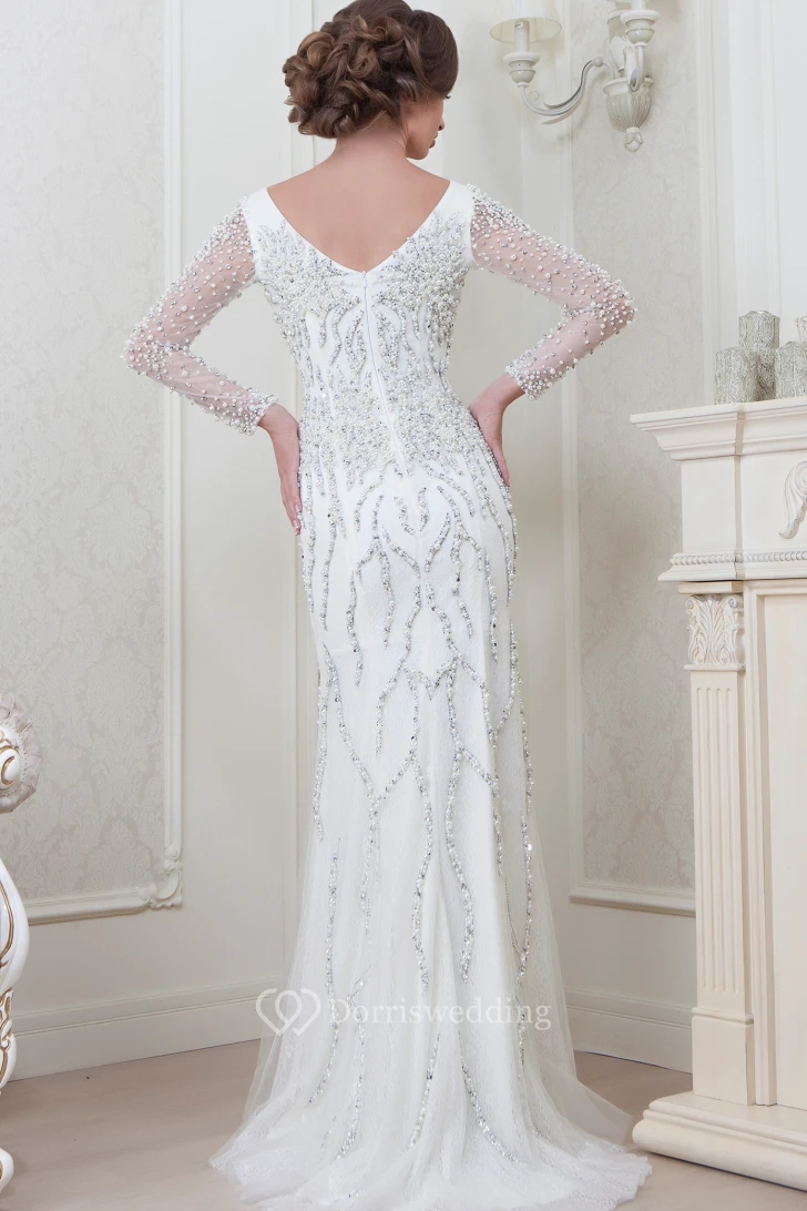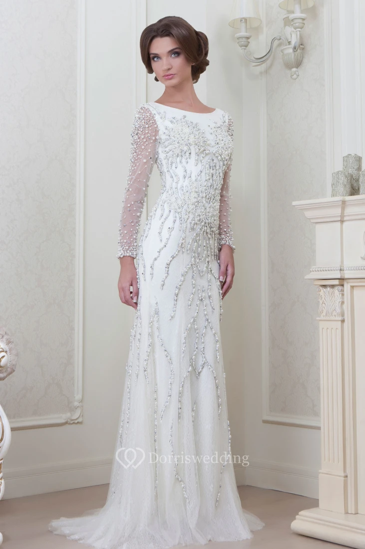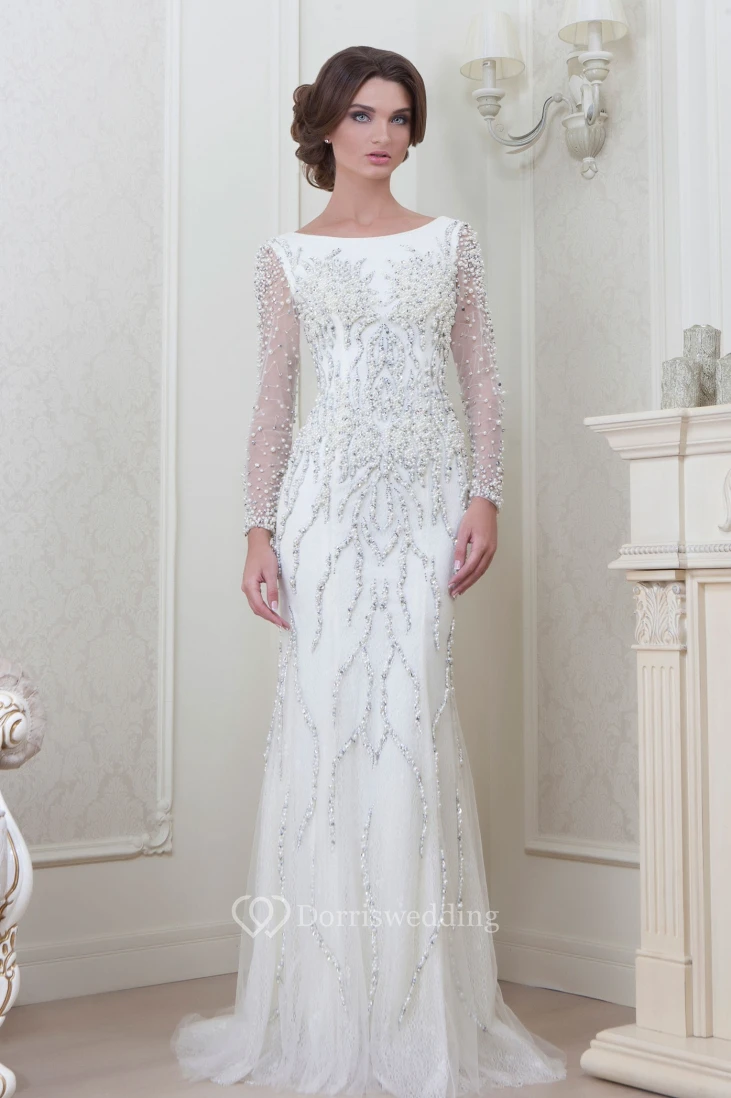 Sheath Floor-Length Beaded Long-Sleeve Jewel-Neck Tulle Evening Dress
