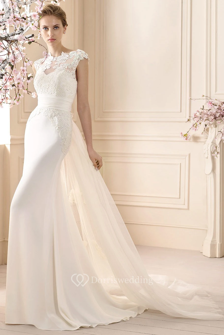 Sheath Floor-Length Cap-Sleeve Appliqued High-Neck Jersey Wedding Dress