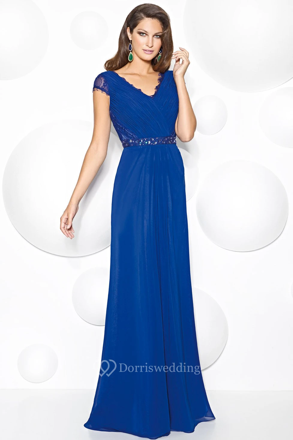 Sheath Floor-Length Cap-Sleeve V-Neck Lace Chiffon Prom Dress With Waist Jewellery And Ruching