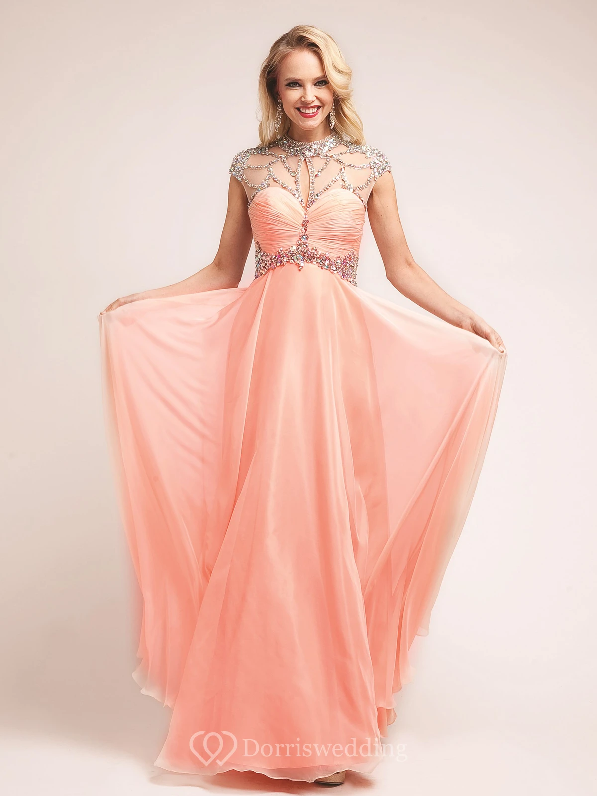 Sheath Floor-Length High Neck Cap-Sleeve Dress With Ruching And Beading