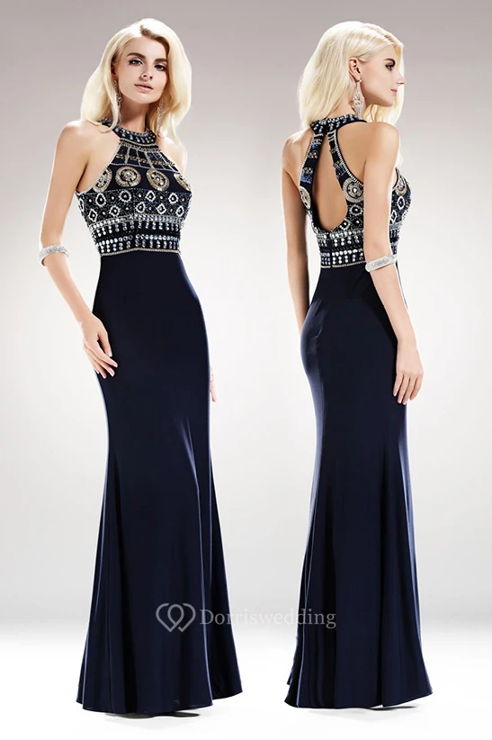 Sheath Floor-Length High Neck Sleeveless Jersey Keyhole Dress With Beading