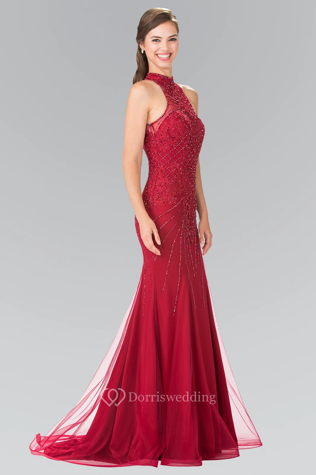Sheath Floor-Length High Neck Sleeveless Tulle Keyhole Dress With Beading
