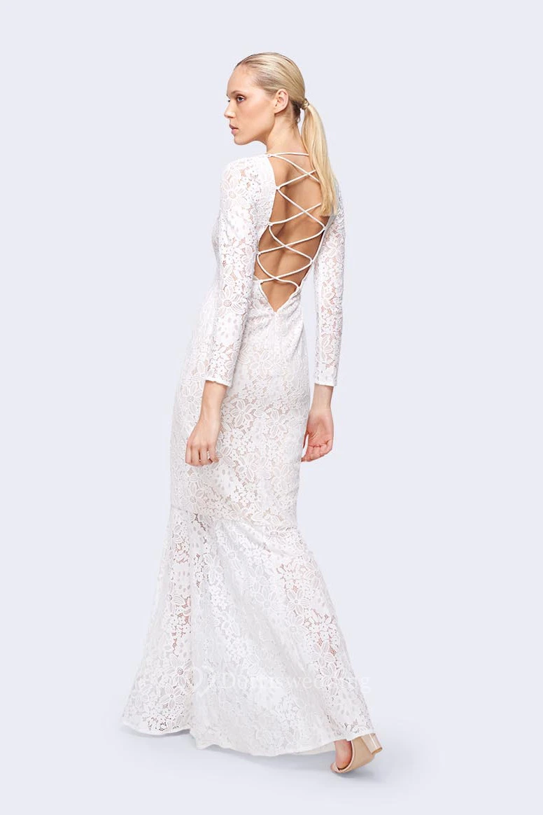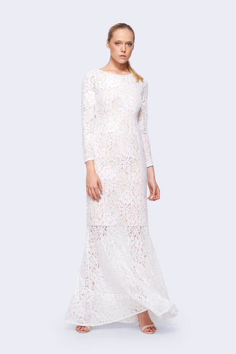 Sheath Floor-Length Jewel-Neck Long-Sleeve Lace Wedding Dress With Straps